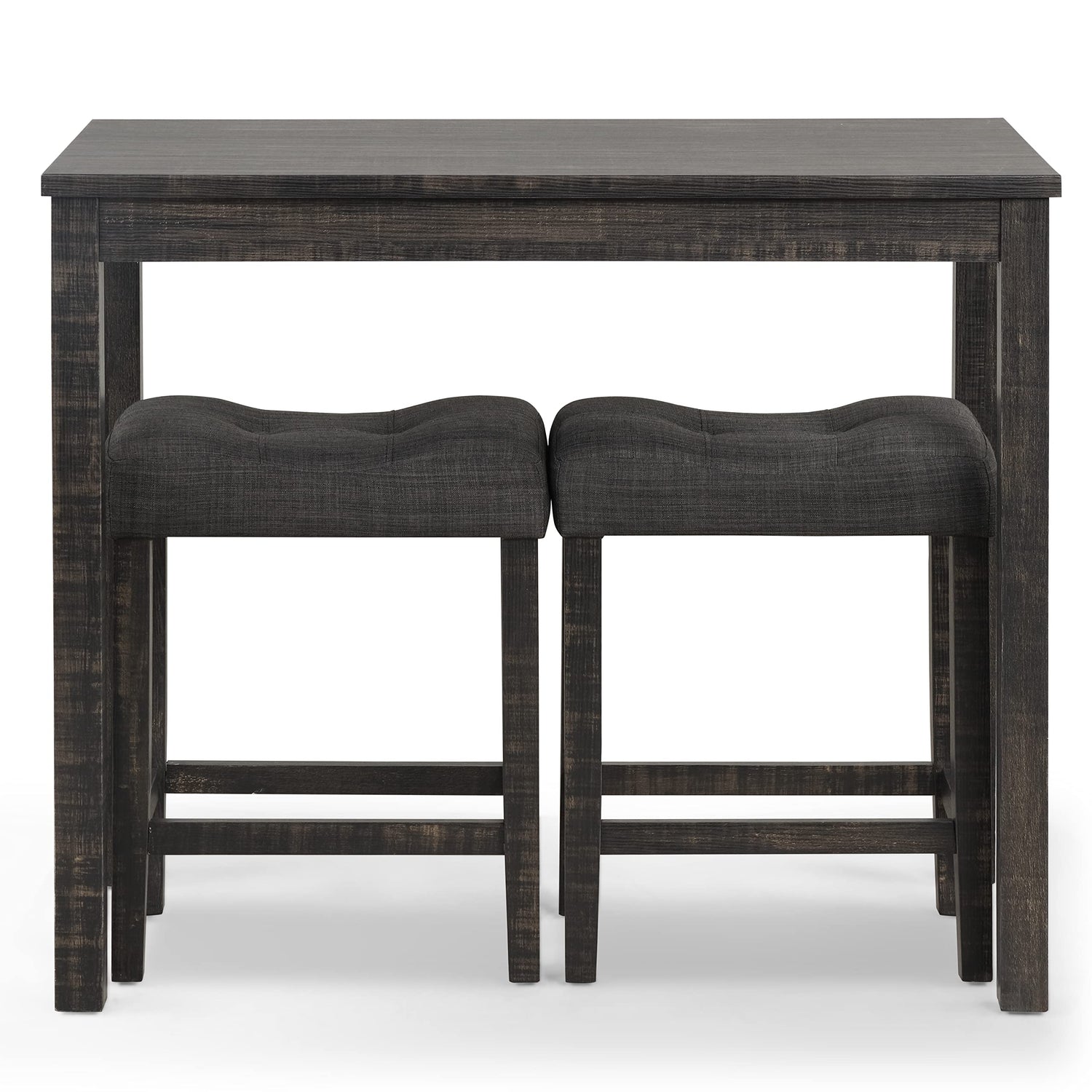 Details: Make the most of your dining space with the Sora Wood 3-Piece Counter Height Dining Set. This space-saving set includes a rectangular counter height table and two saddle stools. A taller height makes this dining set comfortable for both seated guests and those who walk up to chat or help with homework. The stools are upholstered with soft fabric. The dining set is available in gray and taupe finish.