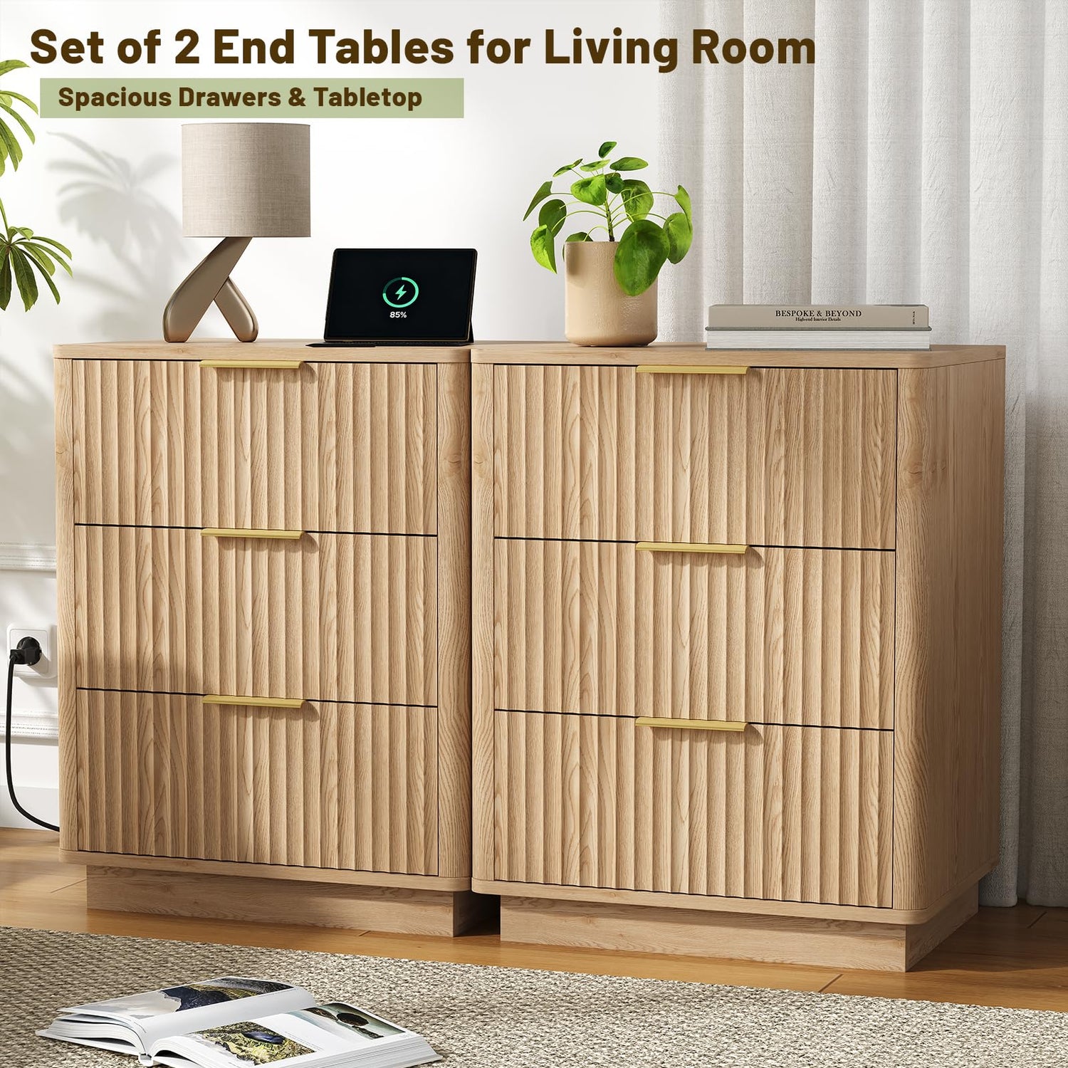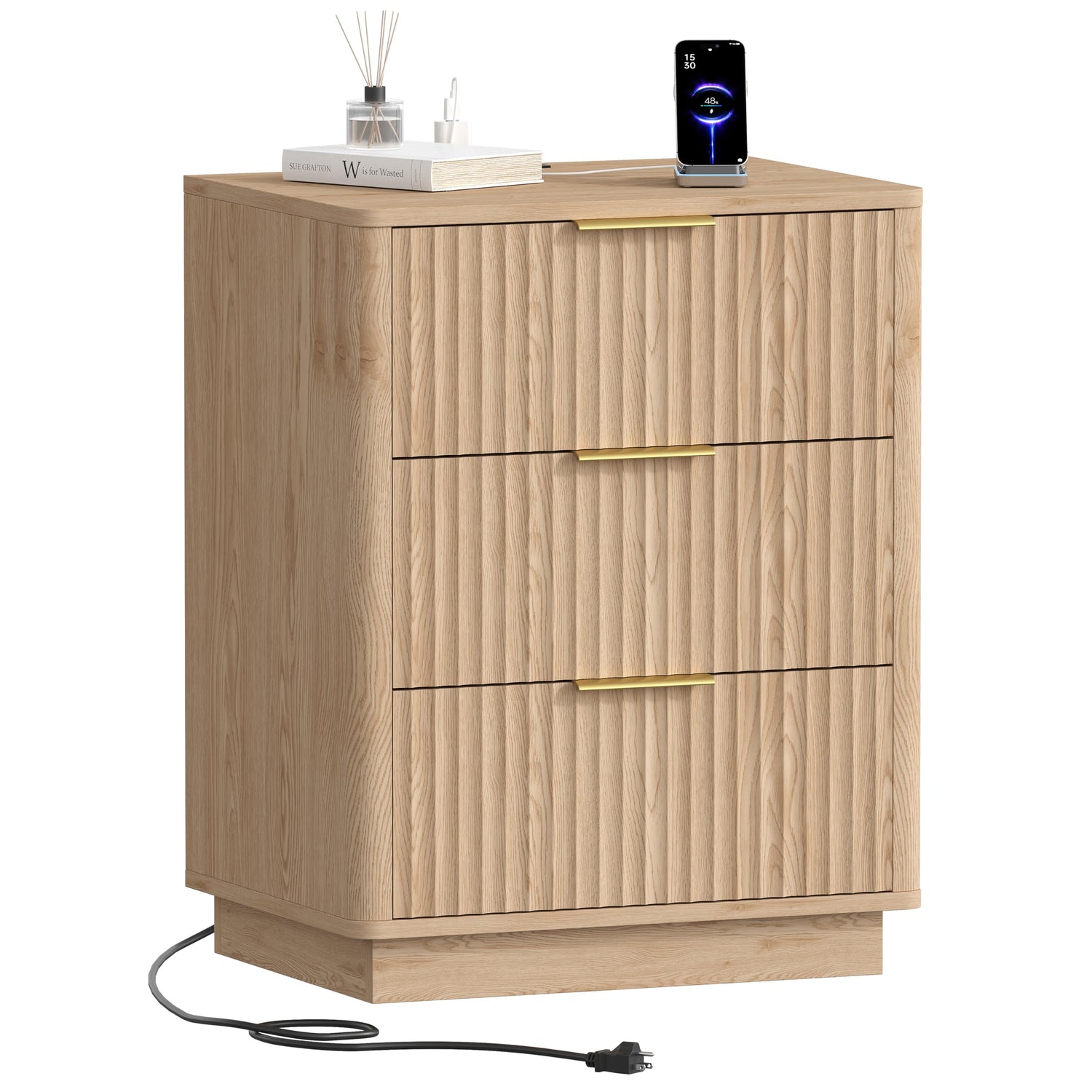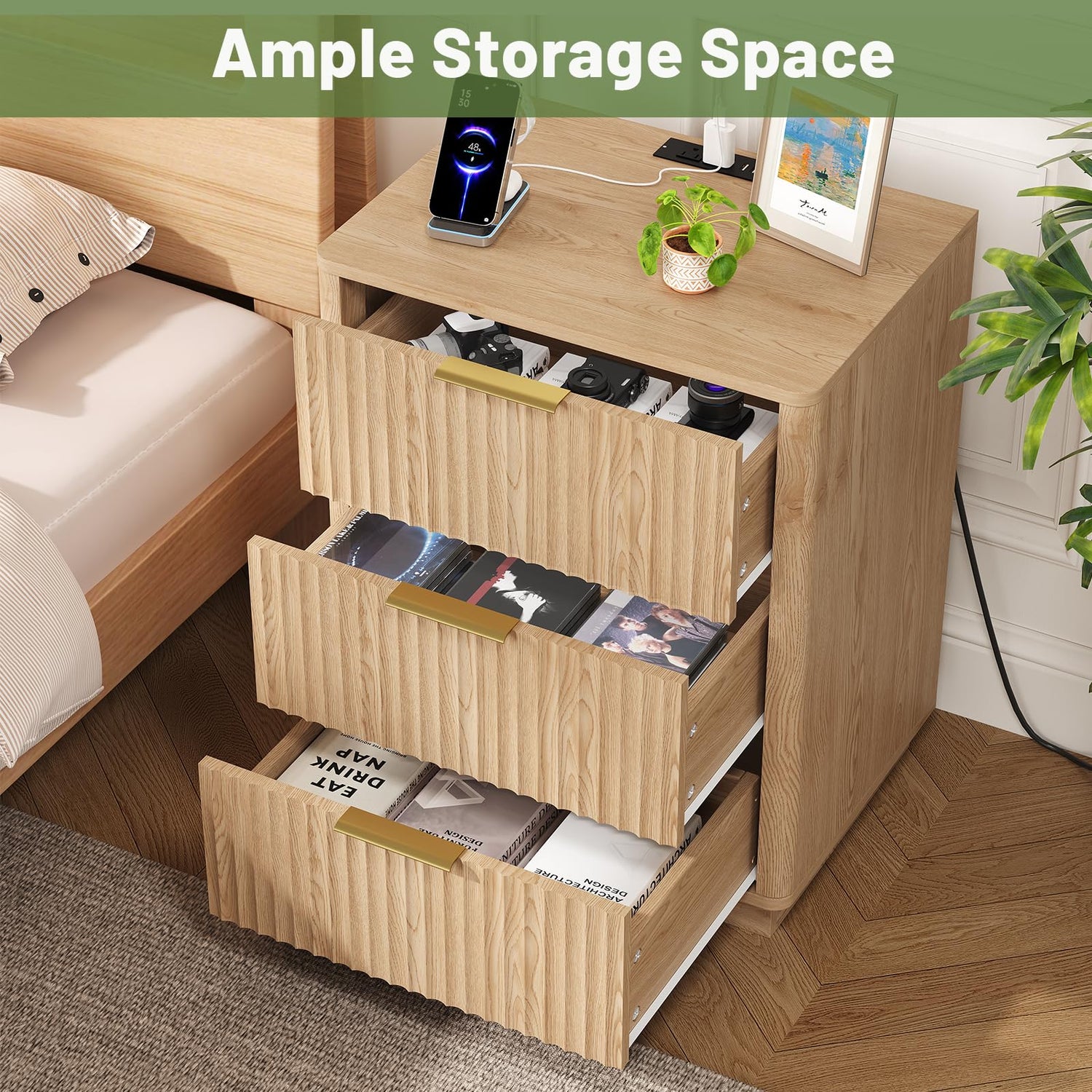 Rovaurx 21.7" Wide Fluted Nightstand with Charging Station, Mid Century Bedside Table with 3 Drawers, Oversized End Table for Bedroom, Curved Profile Design, Natural RCTG115ME