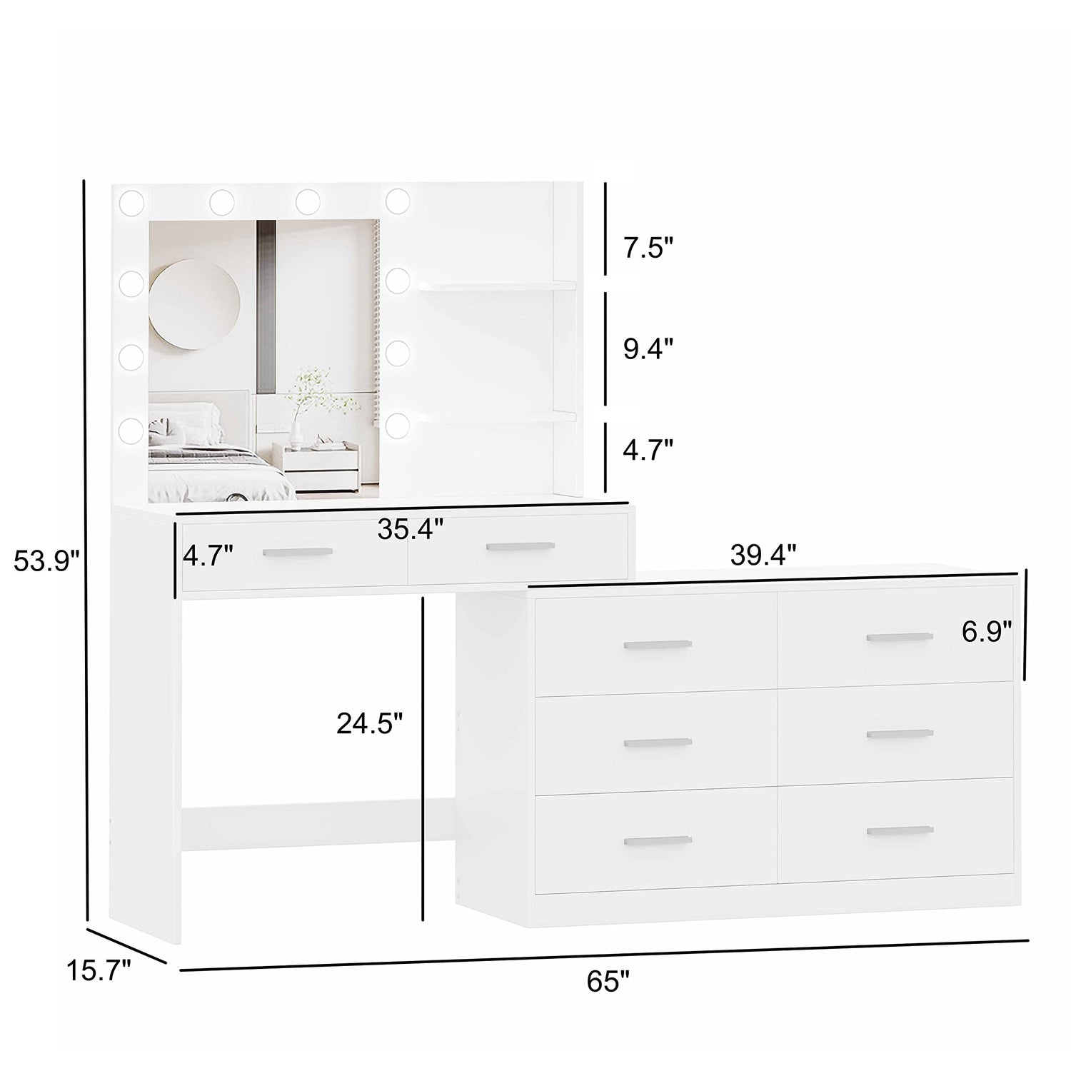Rovaurx 65" Vanity Desk with Lighted Mirror and Lights, 8 Drawers Makeup Vanity Table with Storage Shelf, Modern Vanity with Mirror, Dressing Table for Bedroom, Adjustable Width, White RSZT109W