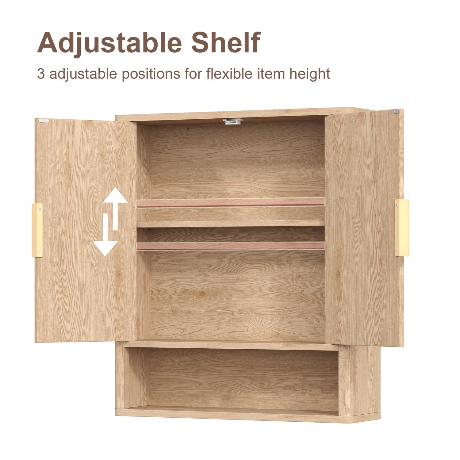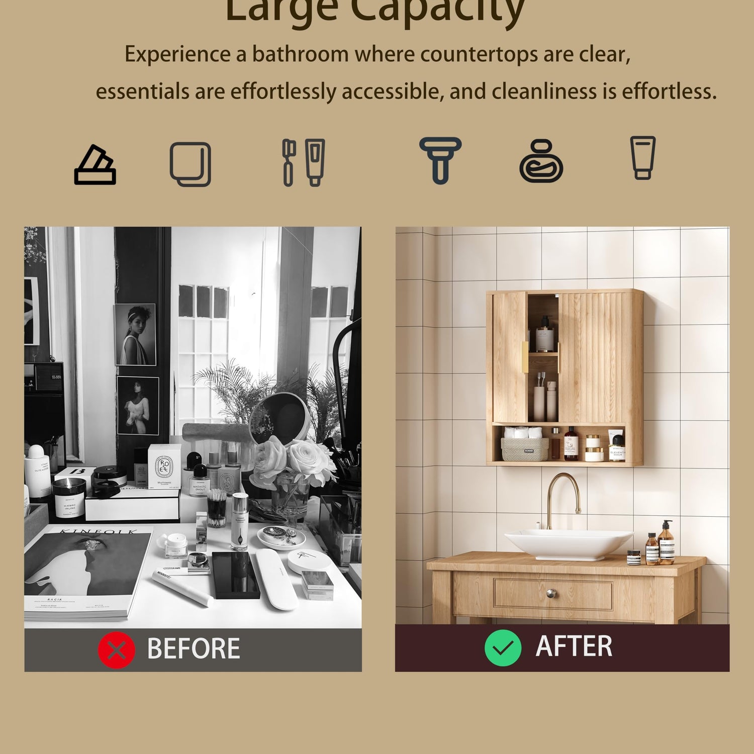Rovaurx Fluted Medicine Cabinet with 2 Doors, Bathroom Wall Cabinet, Curved Profile Wall Mounted Cupboard with Adjustable Shelf, for Bathroom, Kitchen, Laundry Room, Natural