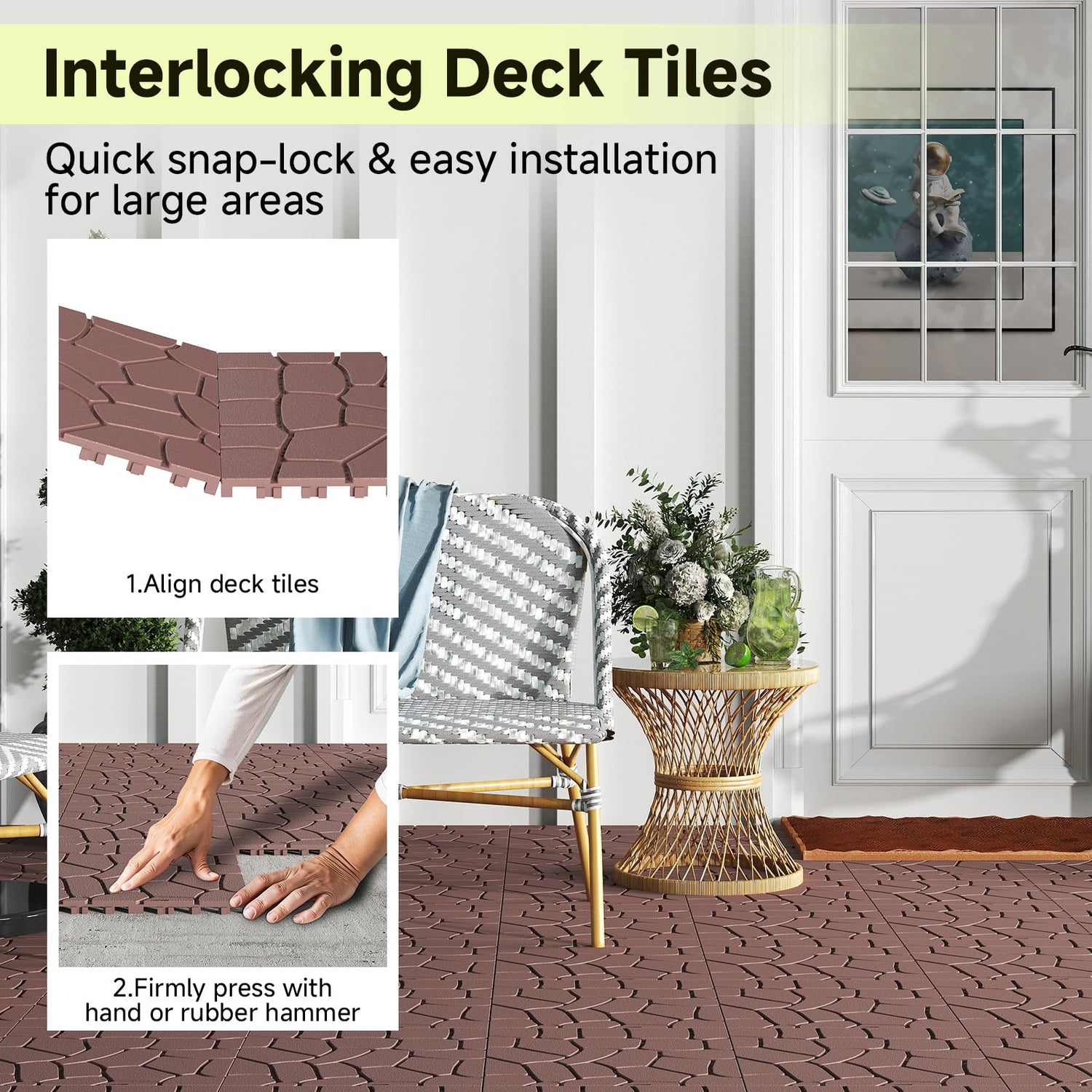 Rovibek 44 PCS Interlocking Deck Tiles, 12" X 12" Plastic Deck Tiles Outdoor Waterproof, All Weather Patio Tiles for Balcony Backyard Poolside Porch, Pavers for Outside Walkway, Stone Brown