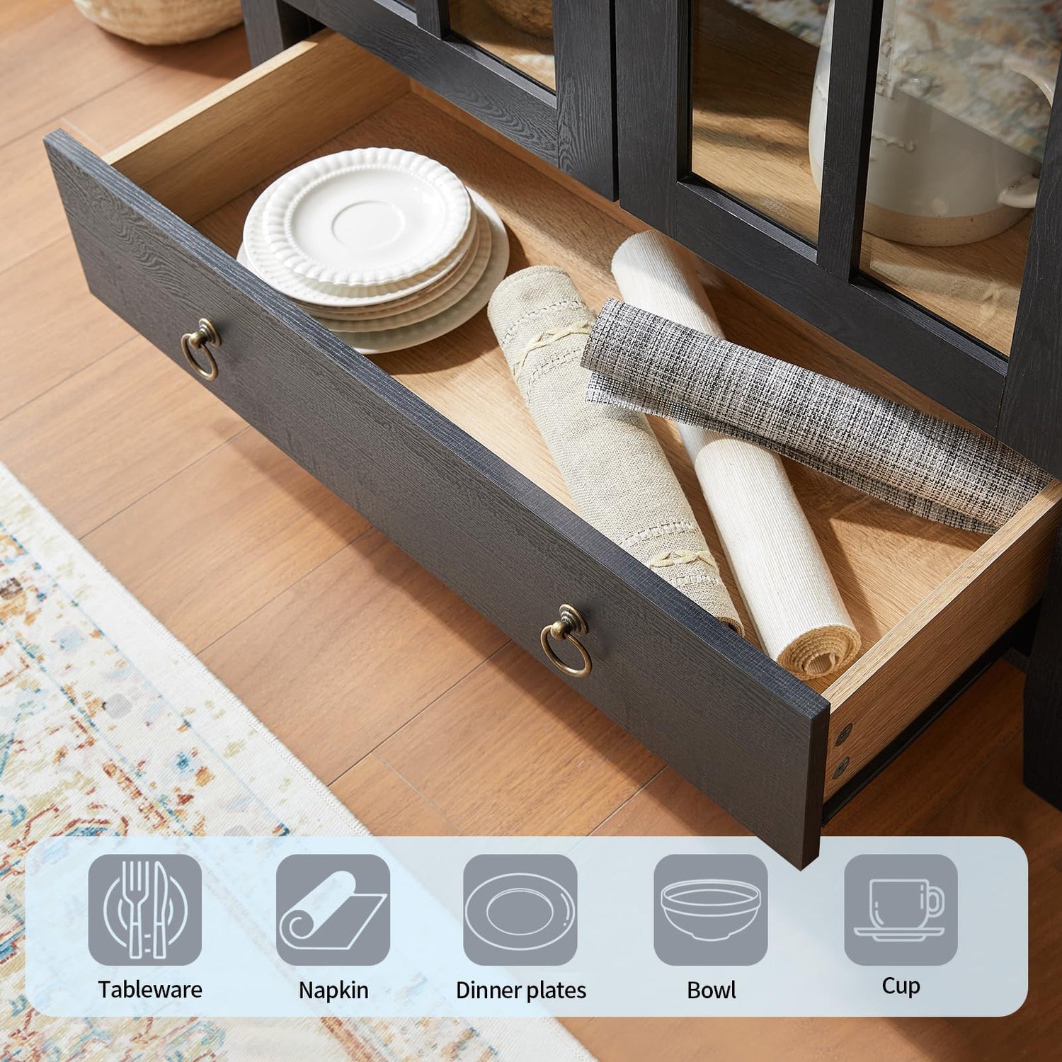 - 6 Tiers of Versatile Storage: This cabinet offers quick access, customizable organization, and concealed storage. Behind the glass doors, multiple shelves, including 2 adjustable shelves, allow you to display and protect pretty decor and customize heights to fit larger items. A bottom drawer provides closed storage below for not-as-pretty items like placemats and other entertaining pieces to store away.