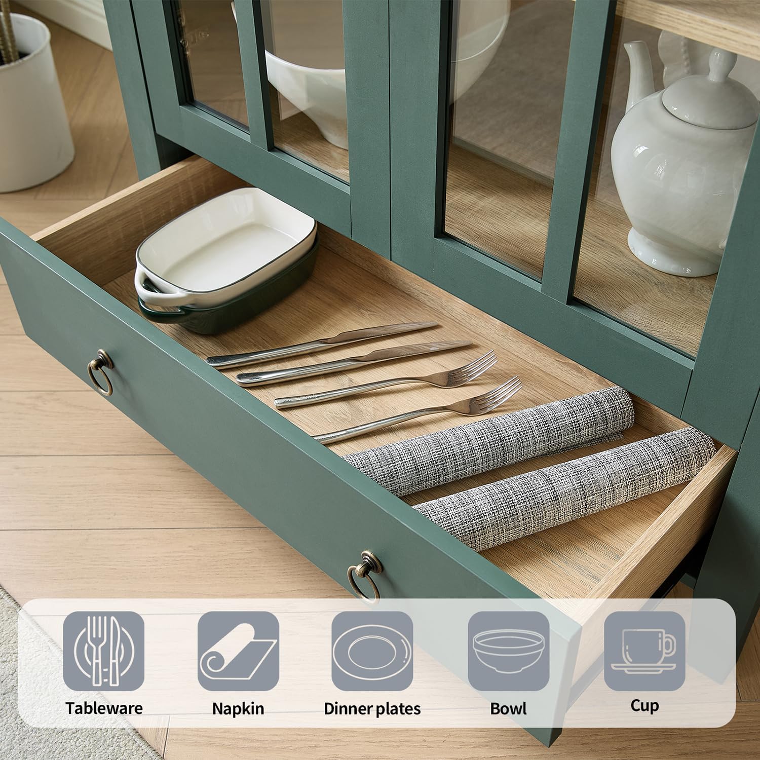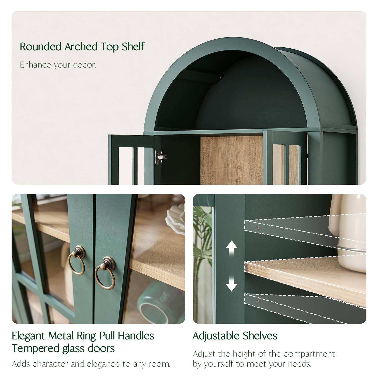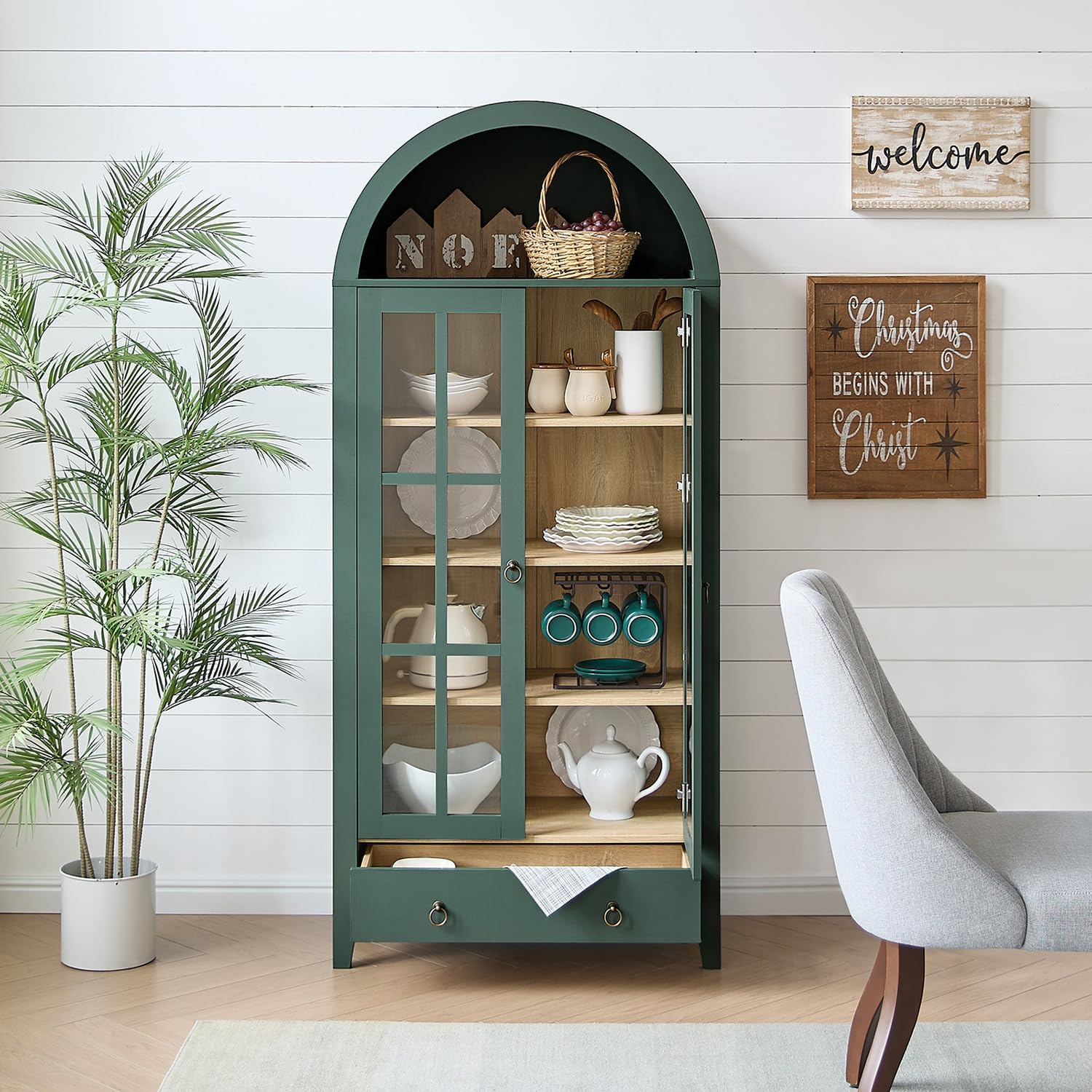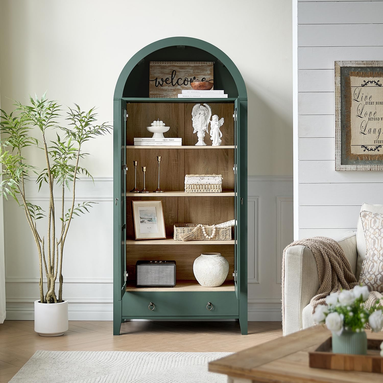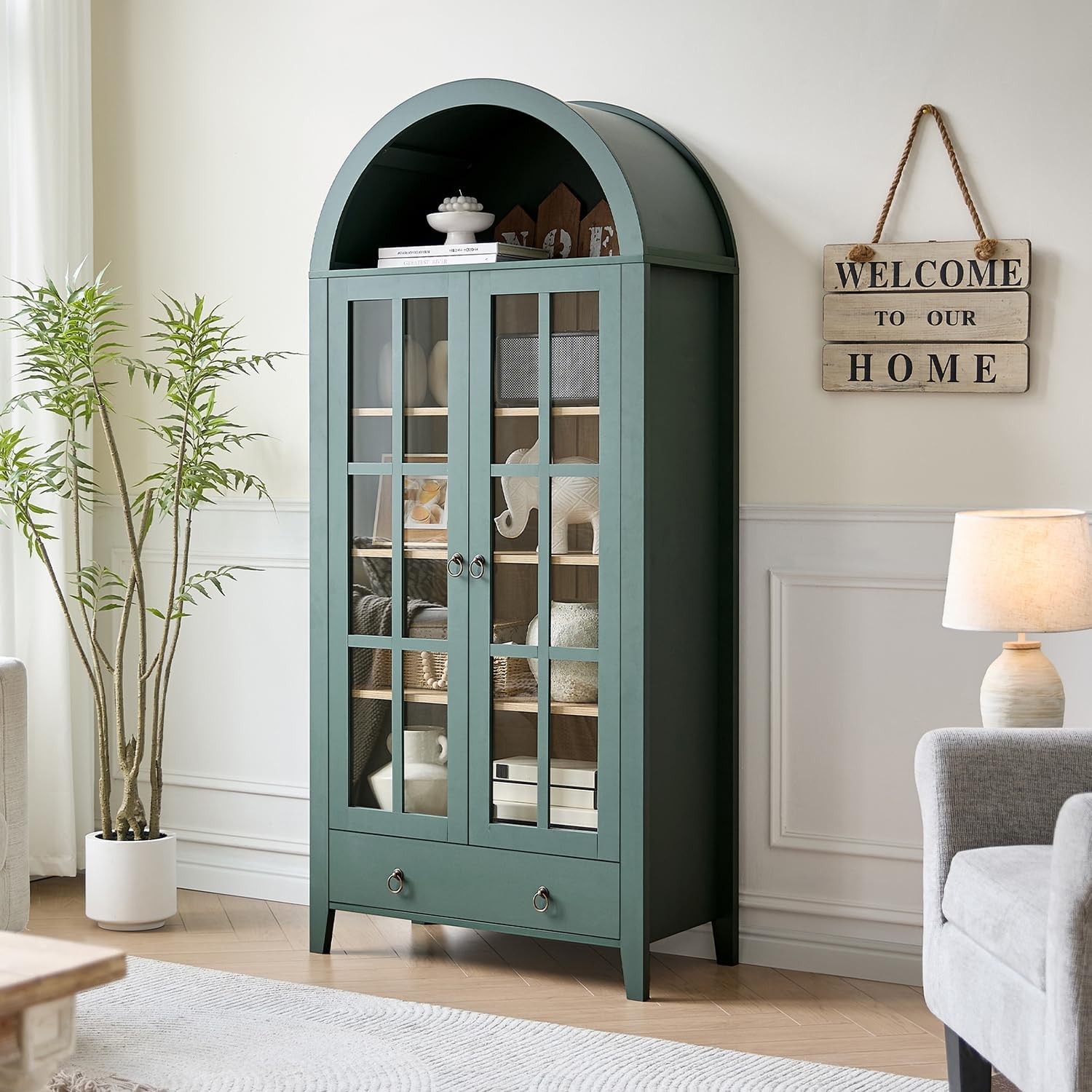 RowyPoey Farmhouse Arched Cabinet with Glass Doors, Wood Display Cabinet with Drawer and Adjustable Shelves, 71” Tall Bookshelf Modern China Storage Kitchen Pantry for Living Room,Office (Green)