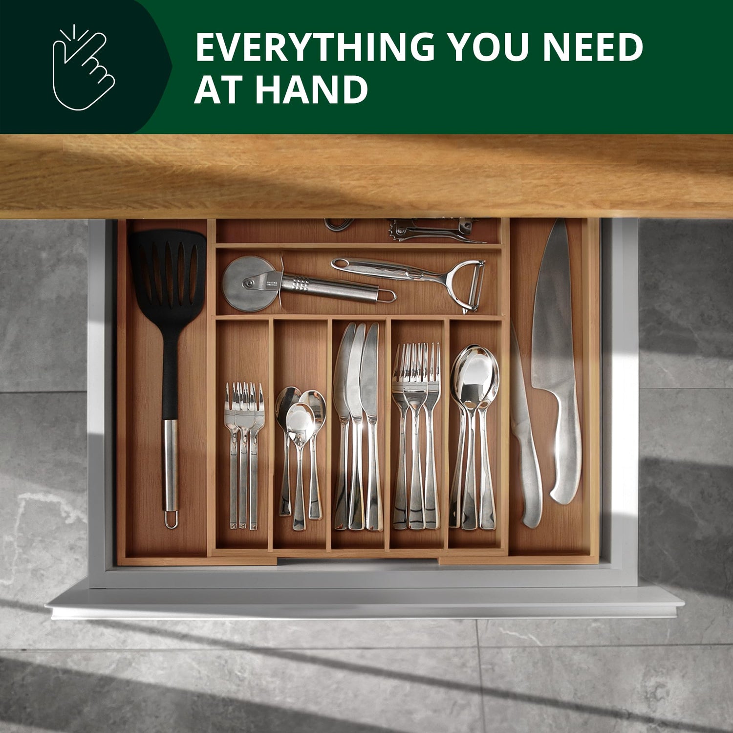 - π πππππππ ππ π ππππππ ππππ πππ πππππππ ππππππ: Our cutlery organizer is not only great for storing flatware, but can also be used as a kitchen drawer organizer for large utensils such as spatulas, spoons, ladles, and more. Find all your kitchen gadgets in one spot, completely hassle free, thanks to the storage containerβs deep compartment walls. Take advantage of our beautiful bamboo organizers expandability and 9 main compartments