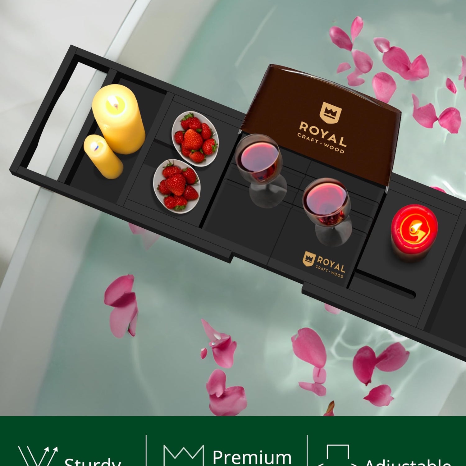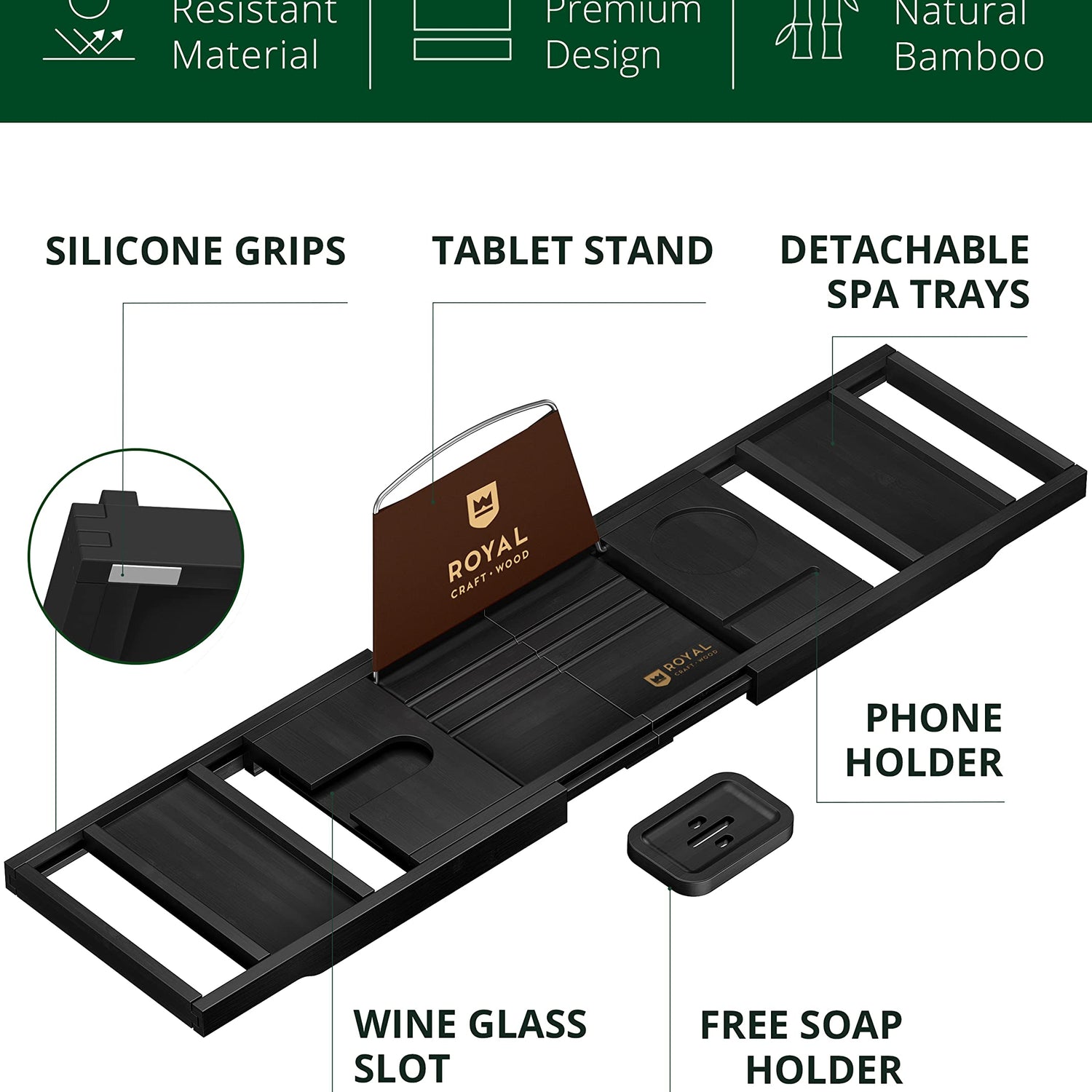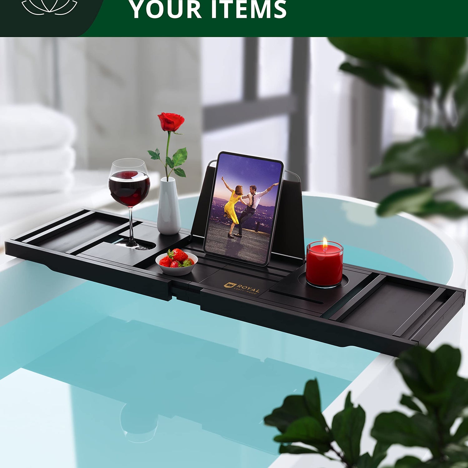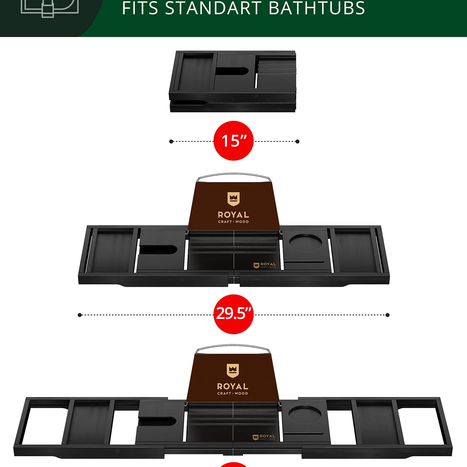 - โ ๐ฌ๐ฟ๐ป๐ฌ๐ต๐ซ๐จ๐ฉ๐ณ๐ฌ: This Royal bamboo bathtub tray has been carefully redesigned to collapse neatly in half for a new bathtub caddy foldable configuration. Still just as accommodating as our classic bath caddy tray for tub use, it too features an expansive, slip-resistant surface. Stretching from 29 ยฝโ - 43โ to meet your tubโs dimensions. With silicone gripped feet underneath, and all the necessary amenities to accommodate and accentuate your bathroom accessories