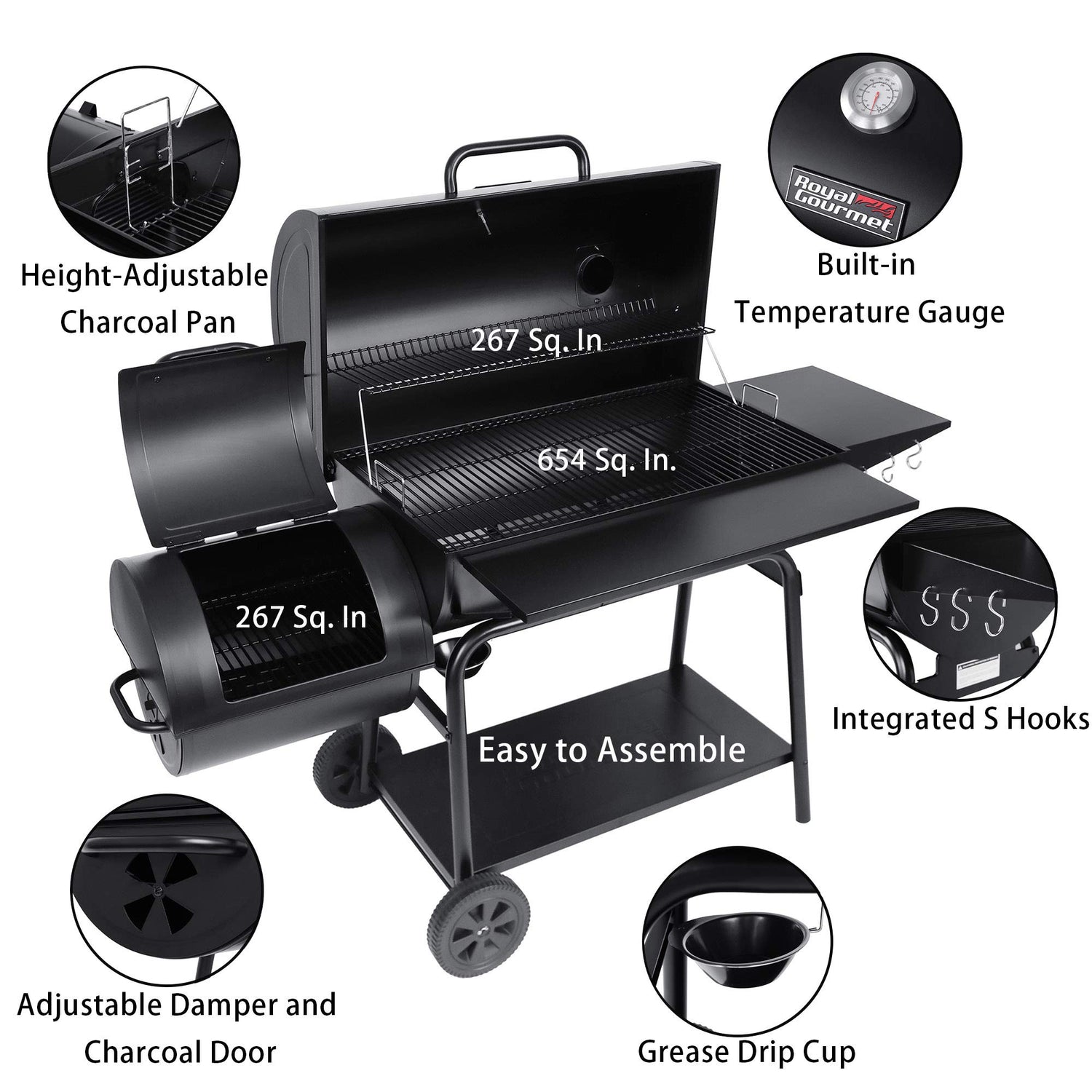 - Offset Smoker: Firmly attached to the main body for good circulation of heat and smoke. And it can also provide additional grilling or smoking cooking space for small side dishes