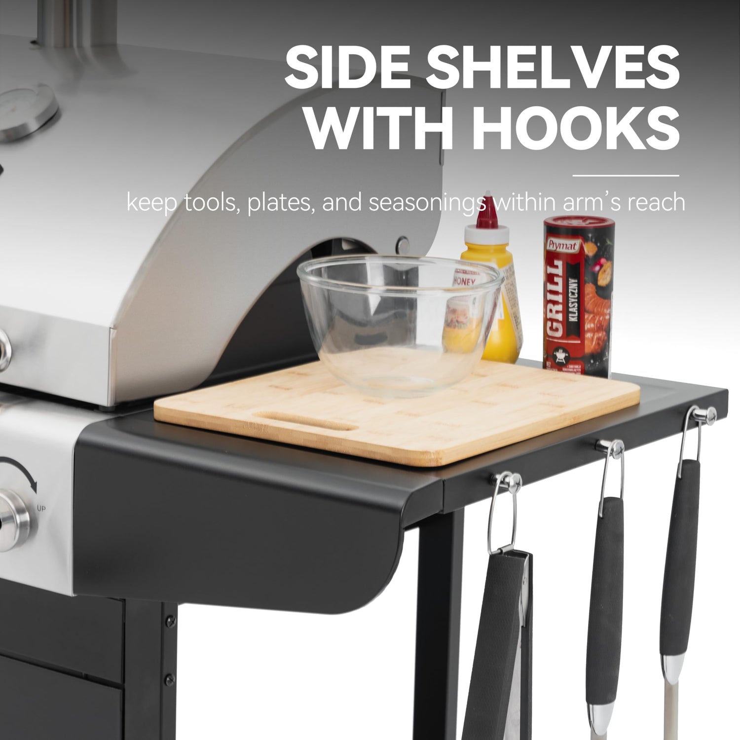 - Extra Prep Space: Two side shelves keep your grill tools, plates, and seasonings within arm’s reach, offering extra prep space. 3 hooks are integrated on both sides for hanging grill accessories.