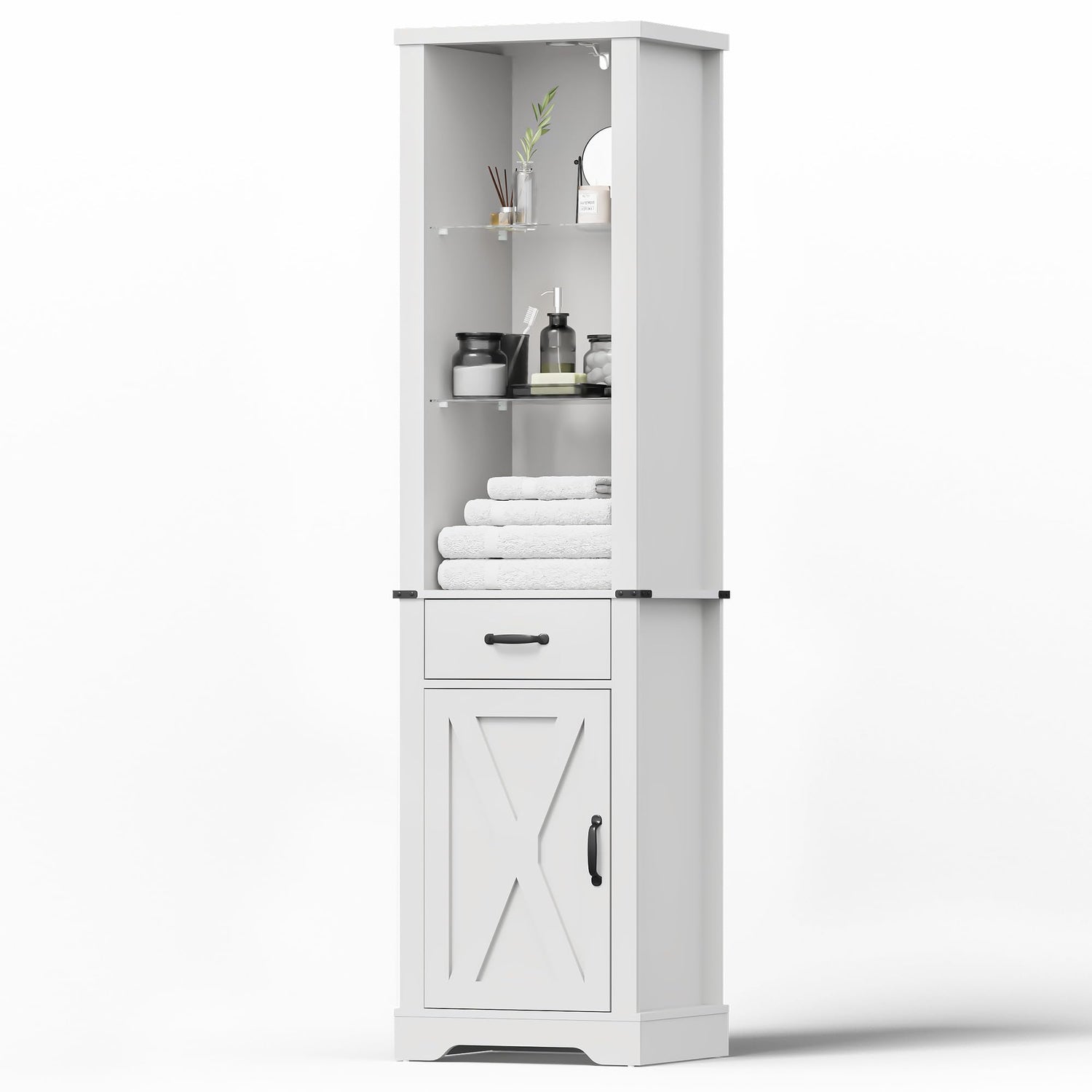 - Ample Storage: This tall slim cabinet offers 3 tiers of open storage above for books, photos, and decorations, with 3- level adjustable shelves for customization. Below, a drawer and a barn door cabinet provide convenient storage options for your personal belongings, with an additional 3-level adjustable shelf inside ensuring organization and style.