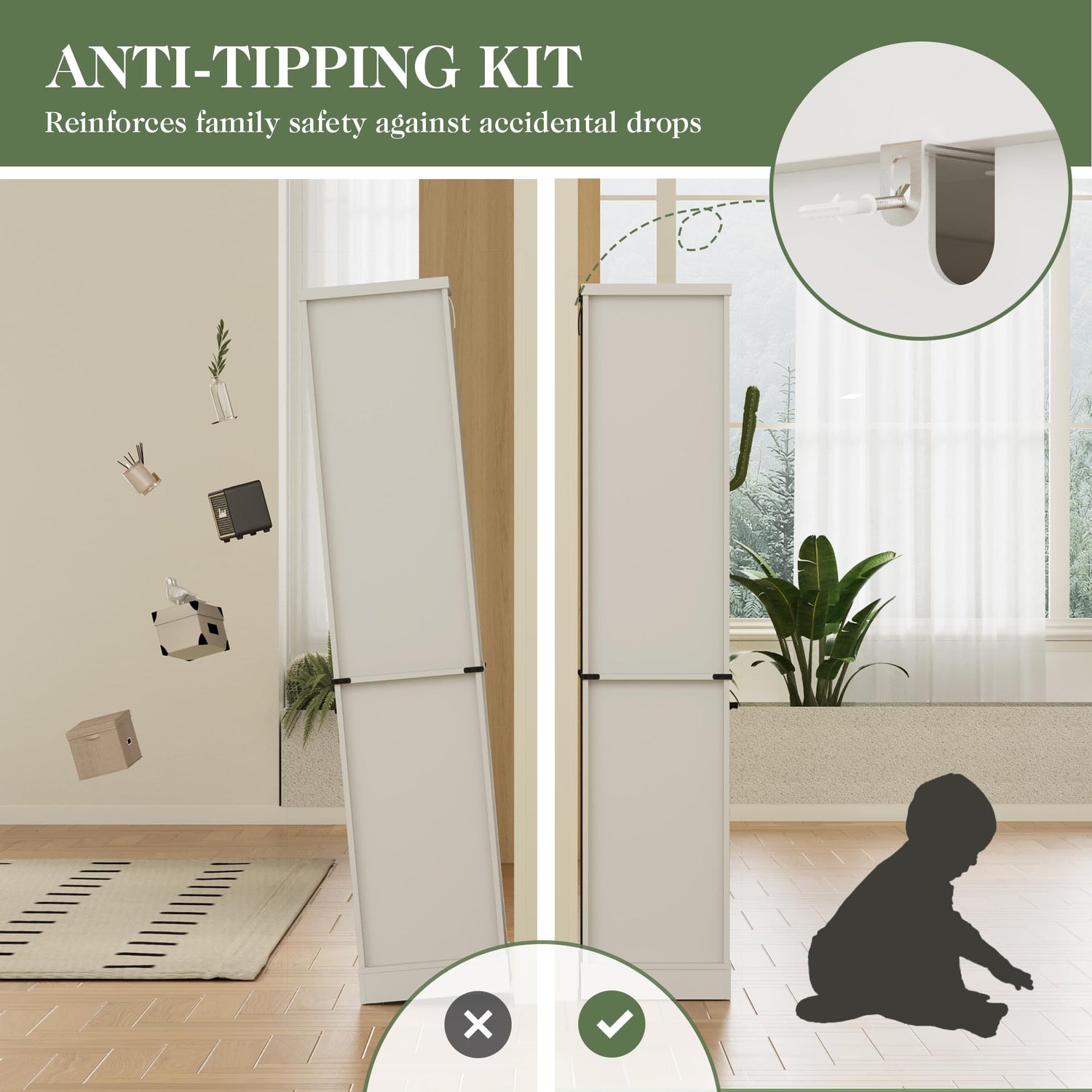 - Safe & Stable: The bathroom storage cabinet, with its reinforced 3.15'' base, ensures stability and durability, reducing wobbling. Its tempered glass shelves provide strong support for the items, keeping them secure and steady, even with heavier or delicate objects. Plus, the anti-tip device adds an extra layer of safety for your family.