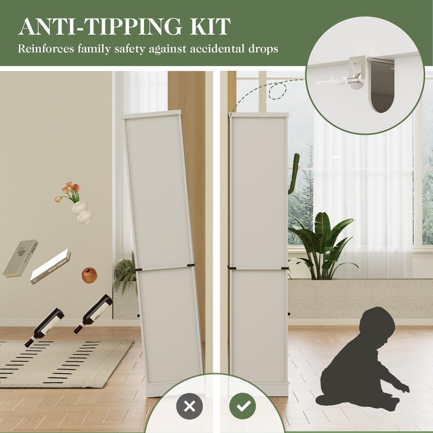 - Safe & Stable: The bathroom storage cabinet, with its reinforced 3.15'' base, ensures stability and durability, reducing wobbling. Its tempered glass shelves provide strong support for the items, keeping them secure and steady, even with heavier or delicate objects. Plus, the anti-tip device adds an extra layer of safety for your family.