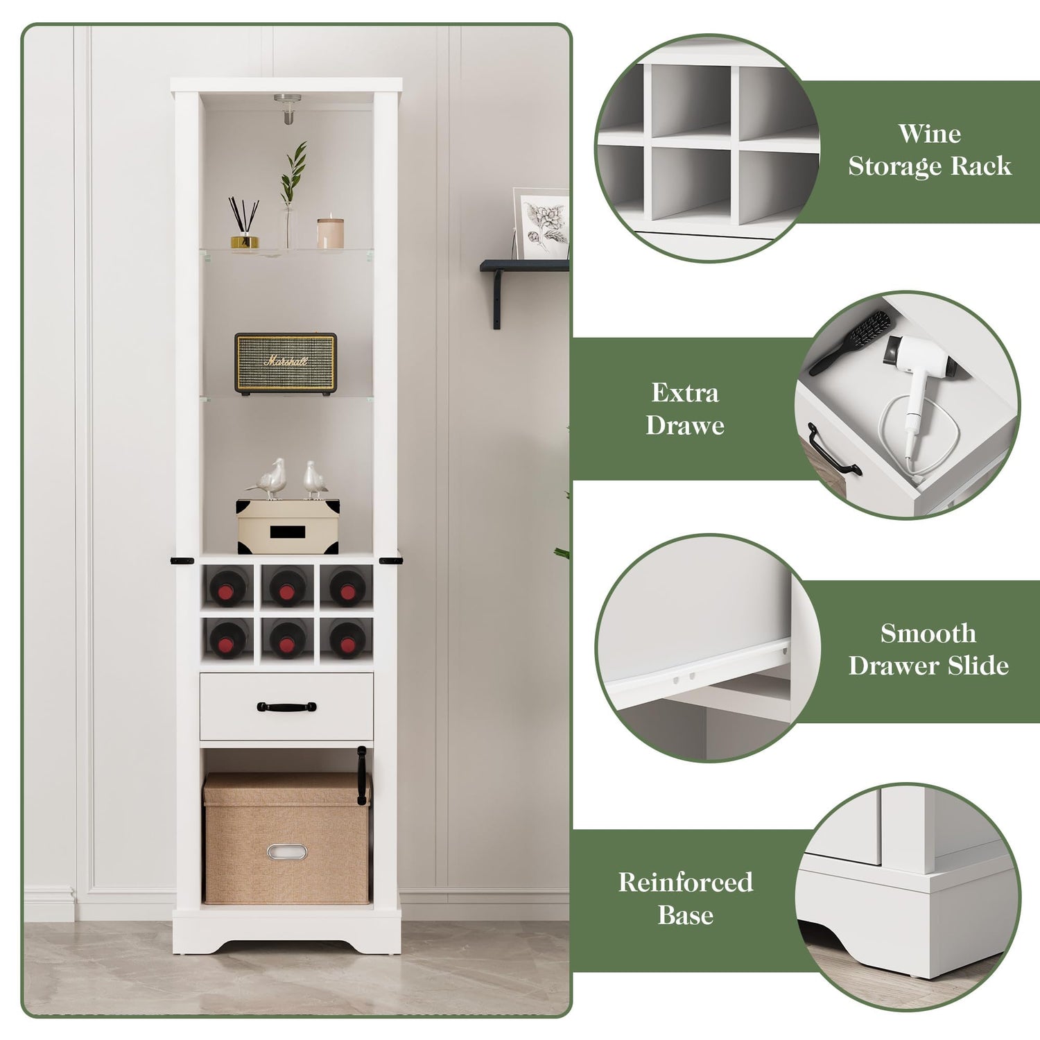 - Ample Storage: This tall slim cabinet offers 3 tiers of open storage above for books, photos, and decorations, with 3- level adjustable shelves for customization. Below, it offers convenient storage for 6 wine bottles, along with a drawer for personal belongings and additional open storage space for displays or other items.