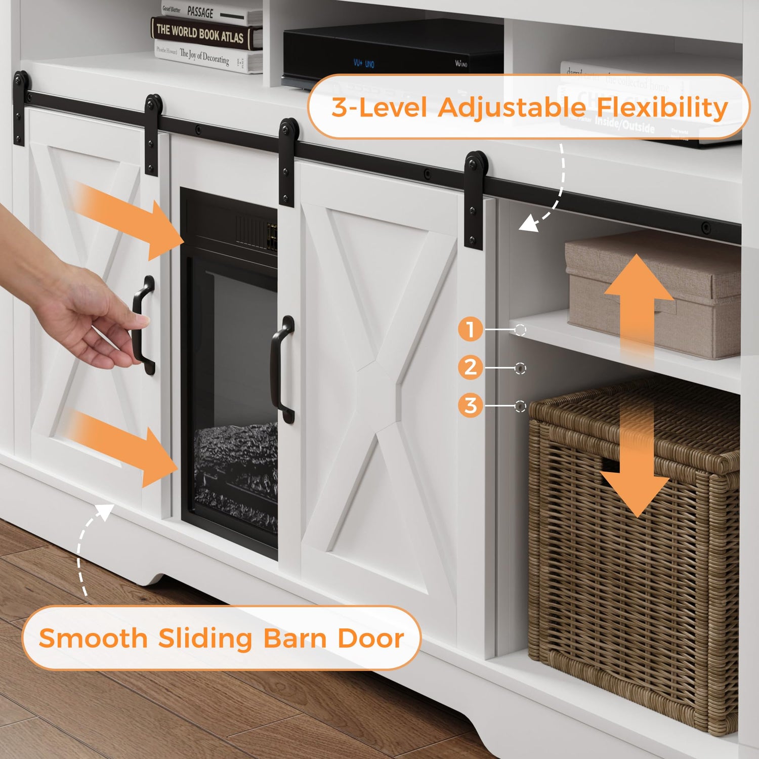 RoyalCraft Farmhouse Fireplace TV Stand for 65+ Inch TV, Entertainment Center with 23" Electric Fireplace with Remote, 34" Tall Modern Rustic TV Console with Sliding Bar Door for Living Room, White