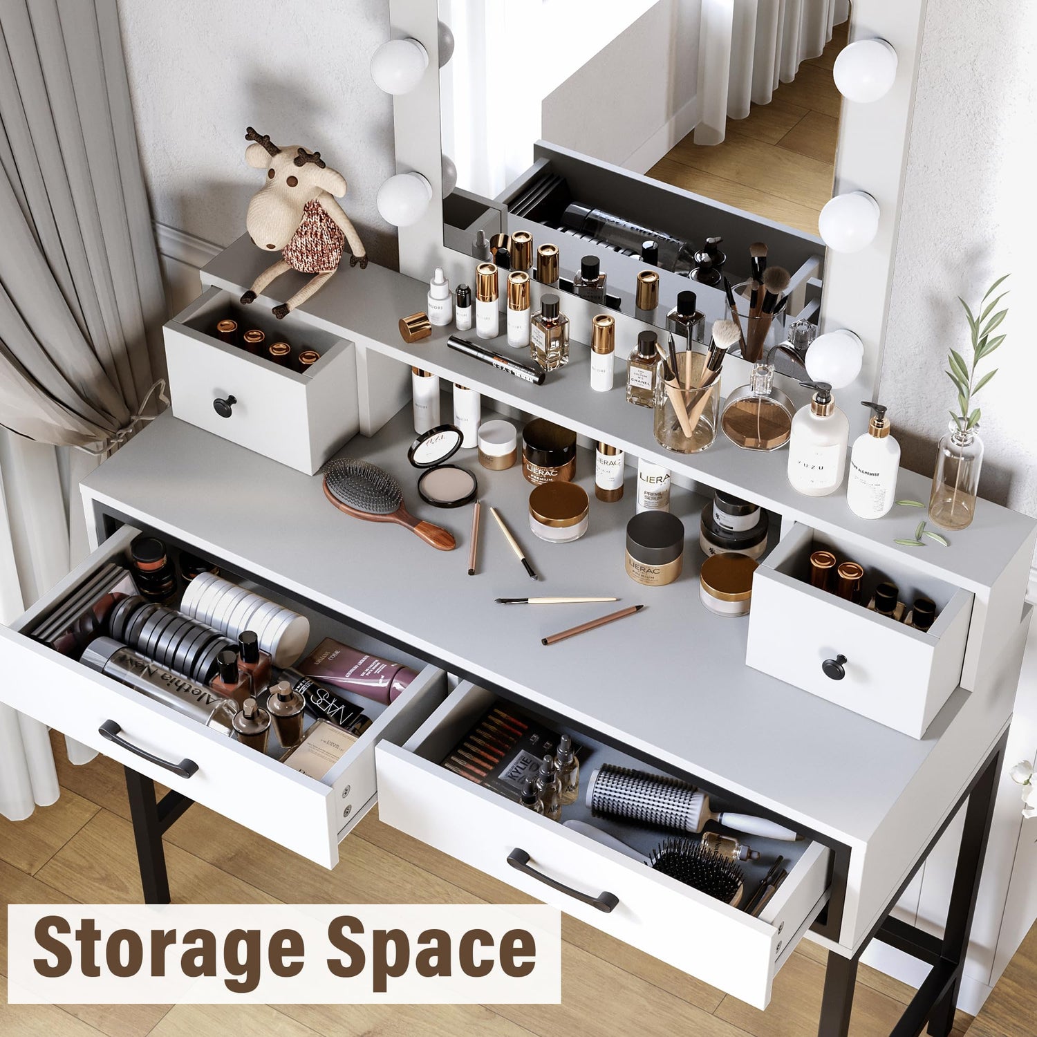 - đăEnhanced Storage Designă This simple style makeup vanity table features 2 pull-out storage drawers for your smaller items like jewelry, along with 2 spacious drawers for organized storage. In addition, there are two layers of storage shelves on the table, which can be used to store your daily use items. Large desktop can meet the makeup, office and other needs at the same time.
