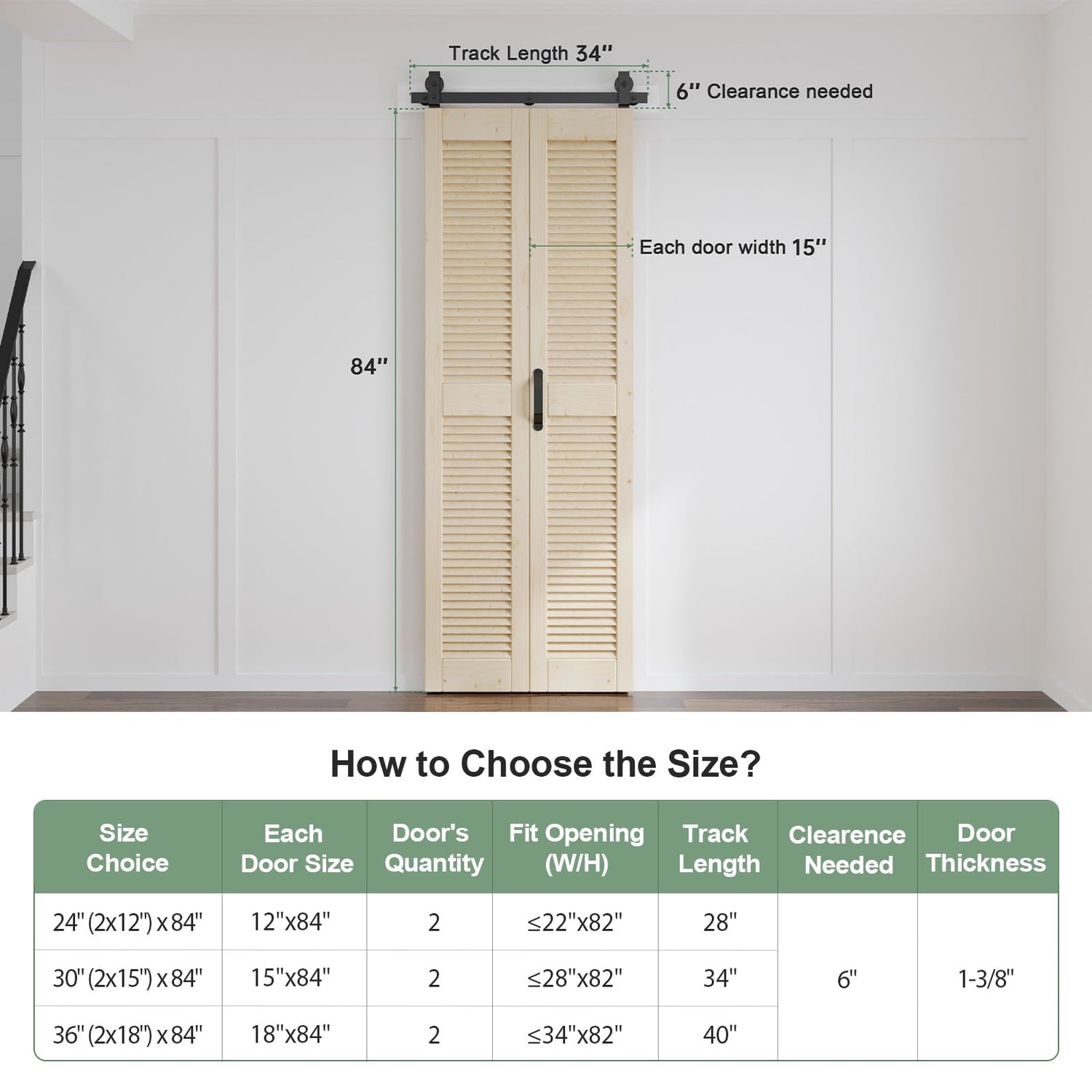 • PRODUCT DETAILS: Door: 30 (2 x 15 Inch) x 84 Inch, Track length: 34 Inch; Recommended door size is opening size (max 28 Inch x 82 Inch) + 2 Inch. (Note: The header board is not included; Door is an assembled finished product, just need to assemble the hardware)