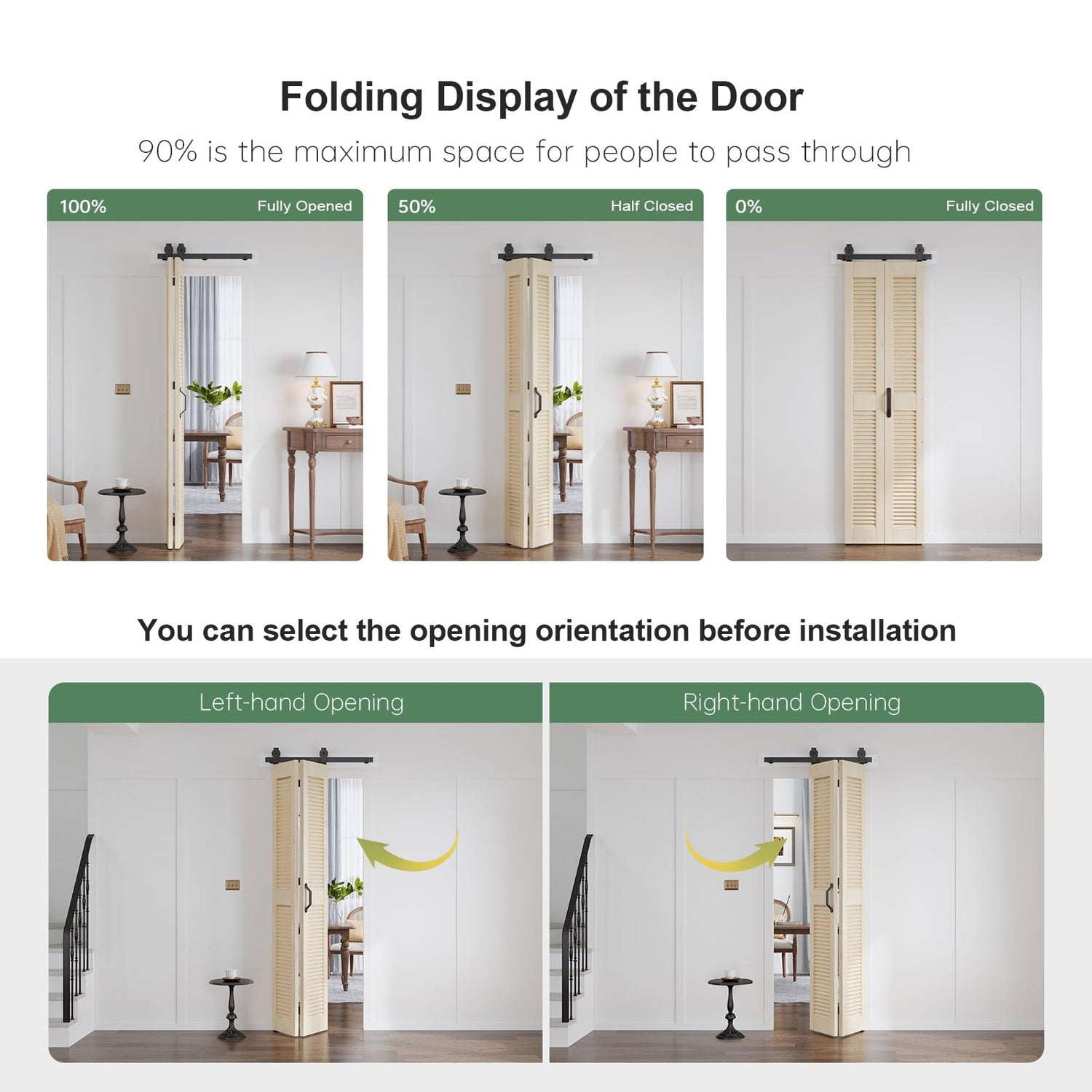 • SAVE SPACE: This is a nice change from the traditional barn door on the market. The folding feature is ingenious and allows you to install this style without requiring all that additional wall space on the side.