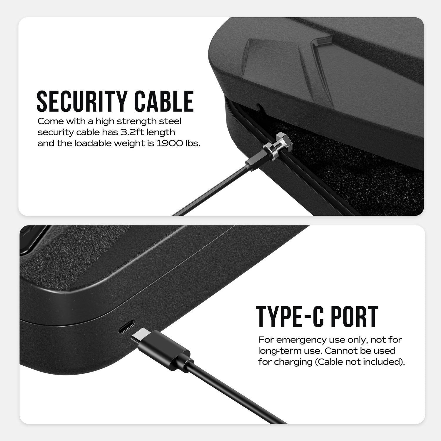 - Emergency Power Supply: The fingerprint safe is designed with a built-in USB Type-C port on the side, making it easier to use in an emergency situation when the batteries are dead and the keys are missing. This port is intended for emergency use only and is not intended for long-term use
