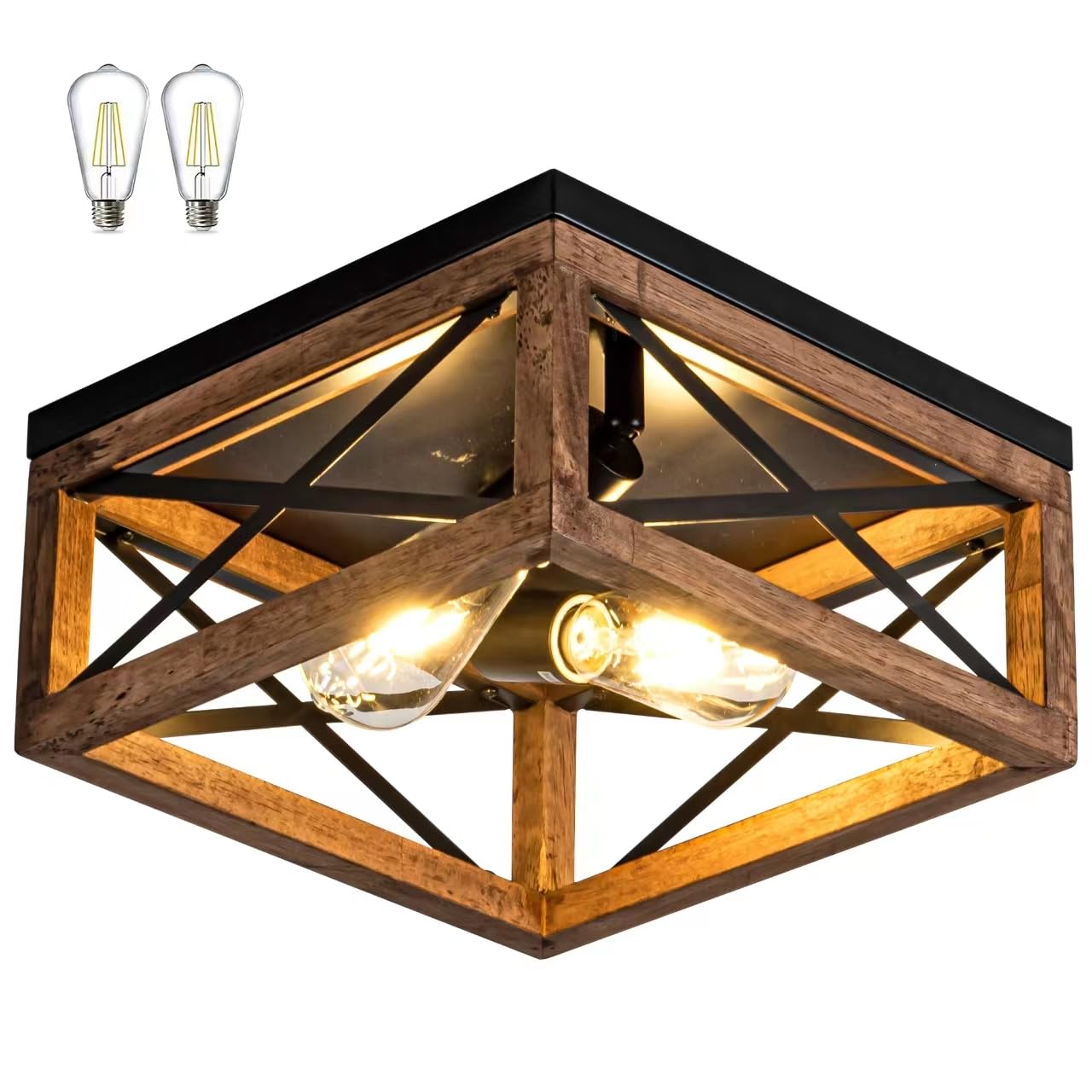 Rpzloila Flush Mount Ceiling Light Fixture for Kitchen Hallway, 2-Light Close to Ceiling Light with Black Metal and Wood Design, Rustic Farmhouse Ceiling