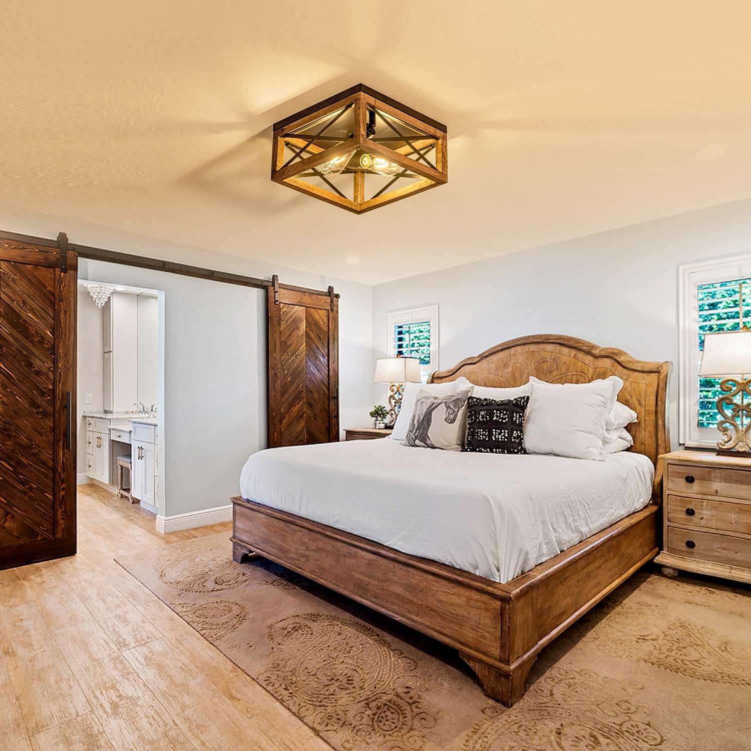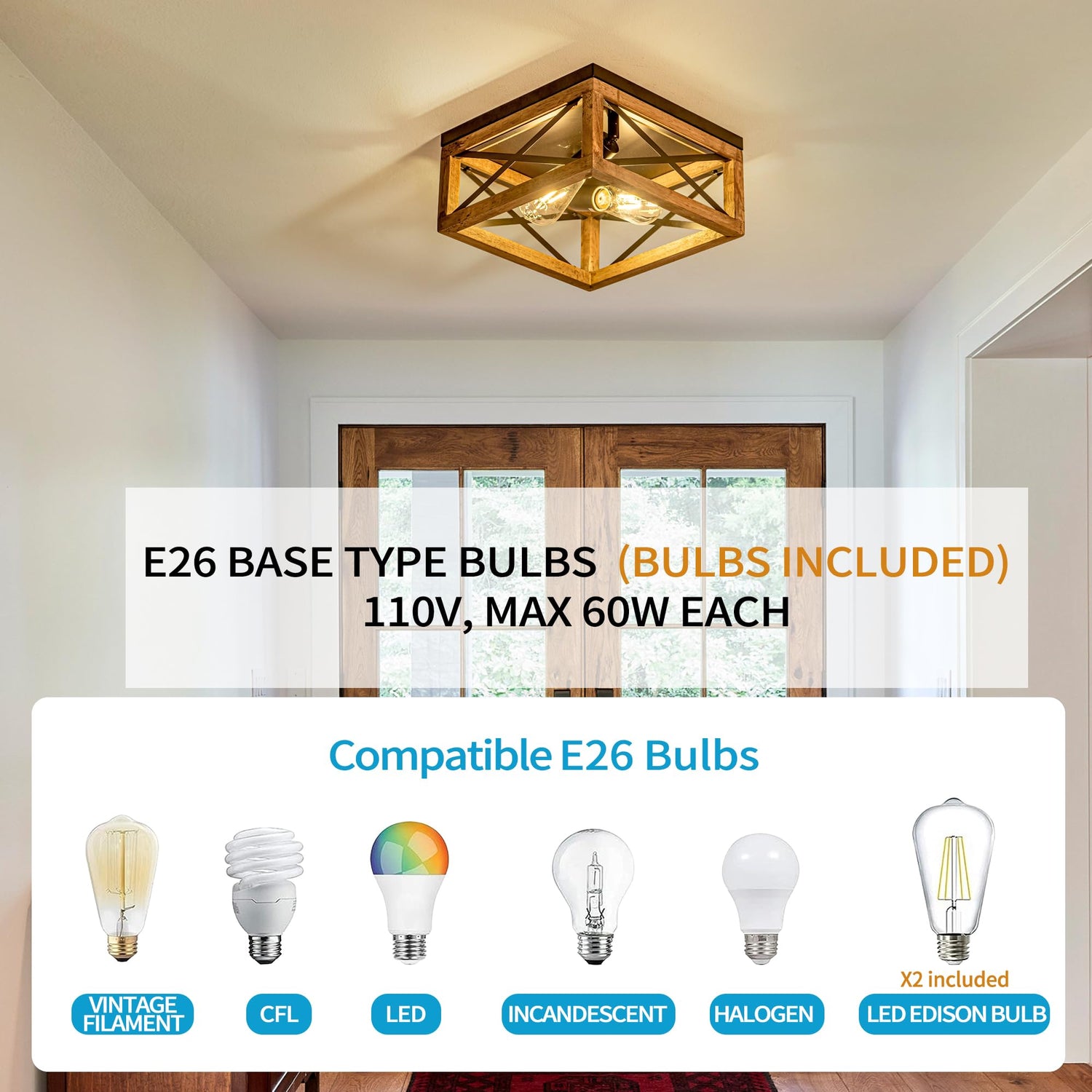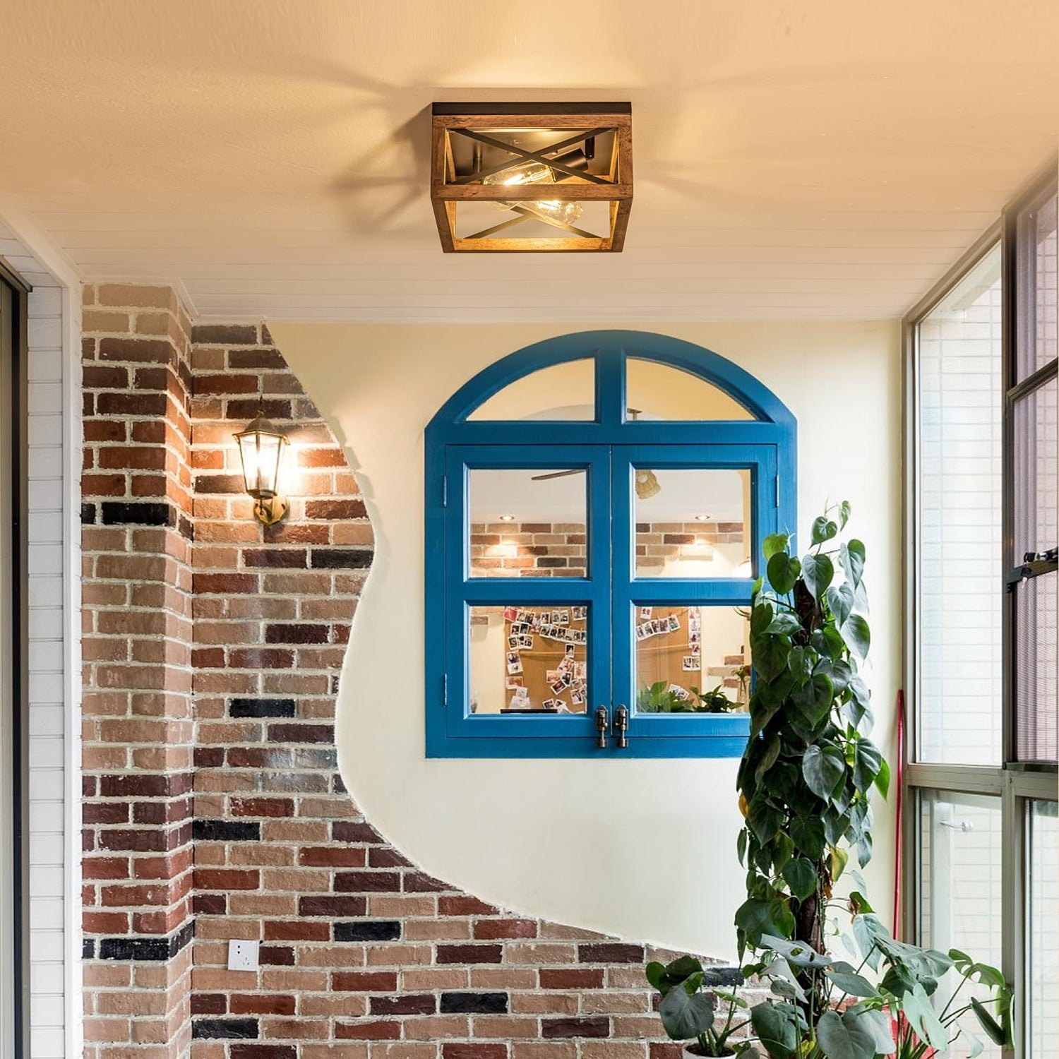 - 【Rustic Farmhouse design】The ceiling light is a good combination of wood and metal, features X frames structure and wood decoration provides retro style and unique looking for updating your home. Flush mount ceiling light features piano paint process, beautiful and durable.