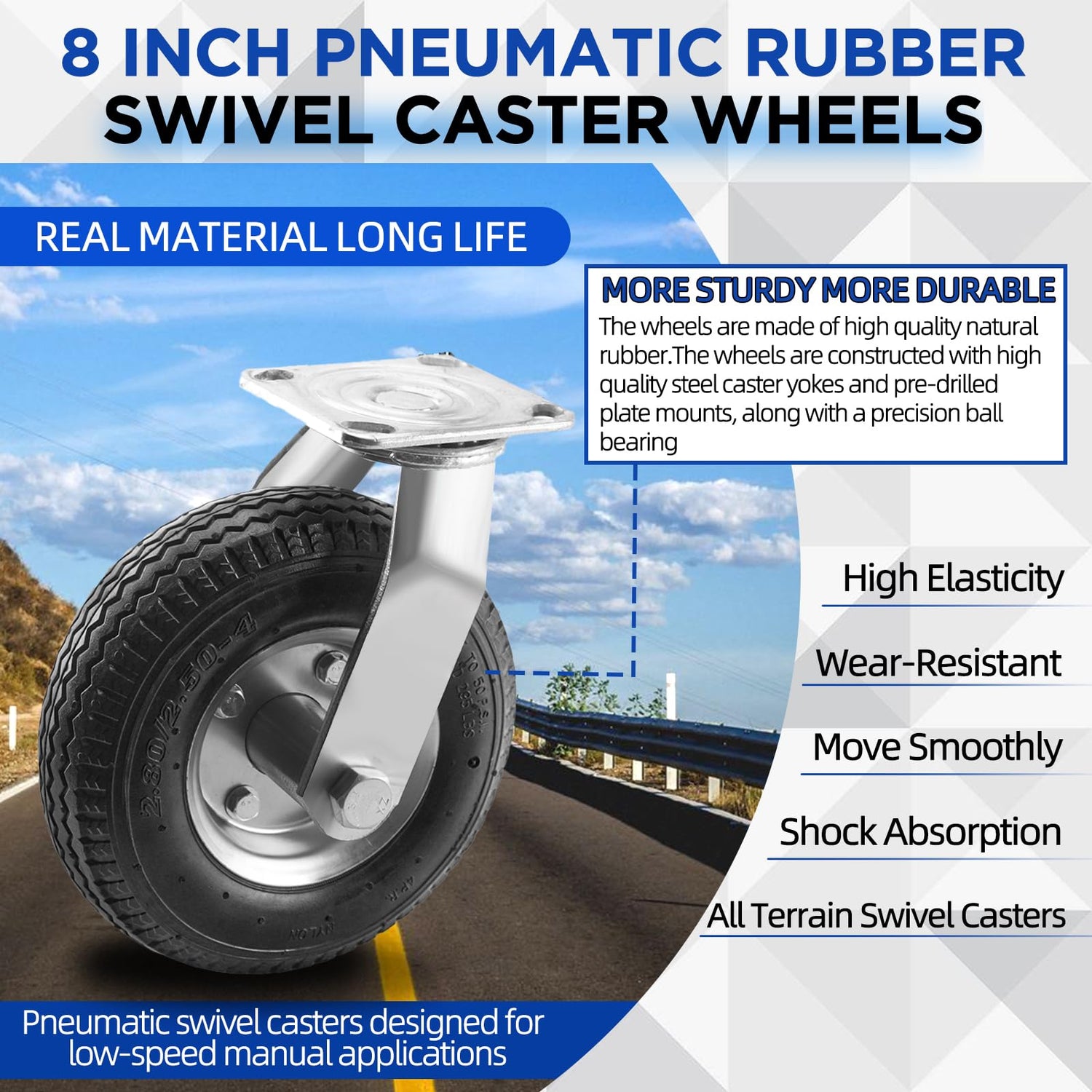 RRQ 8 Inch Caster Wheels, Pneumatic Swivel Caster Wheels with Zinc Top Plate 360 Degree Rotation for Cart, Dolly, Trolley, Workbench and Wagon, Black Rubber Wheels, 590 Lbs Total Capacity (2 Pack)