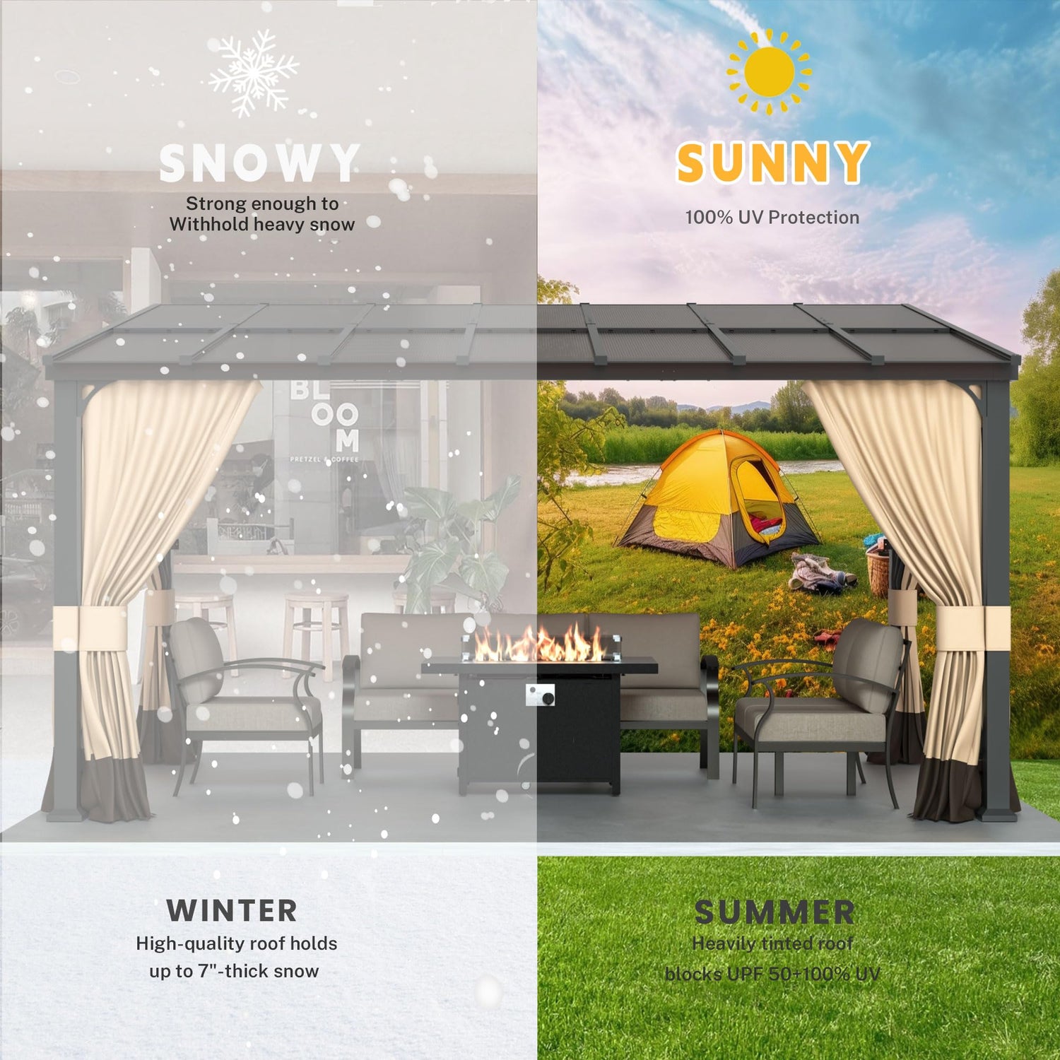 - USAGE SCENARIOS: Gazebo is very large and can accommodate multiple people. You can also place an outdoor furniture set underneath the gazebo. Wall mount heavy hardtop gazebo is suitable for installation on the side of the house, under the eaves, along the porch, in the patio, and is suitable for use next to a wall. Outdoor pergola can be used to host a variety of parties.