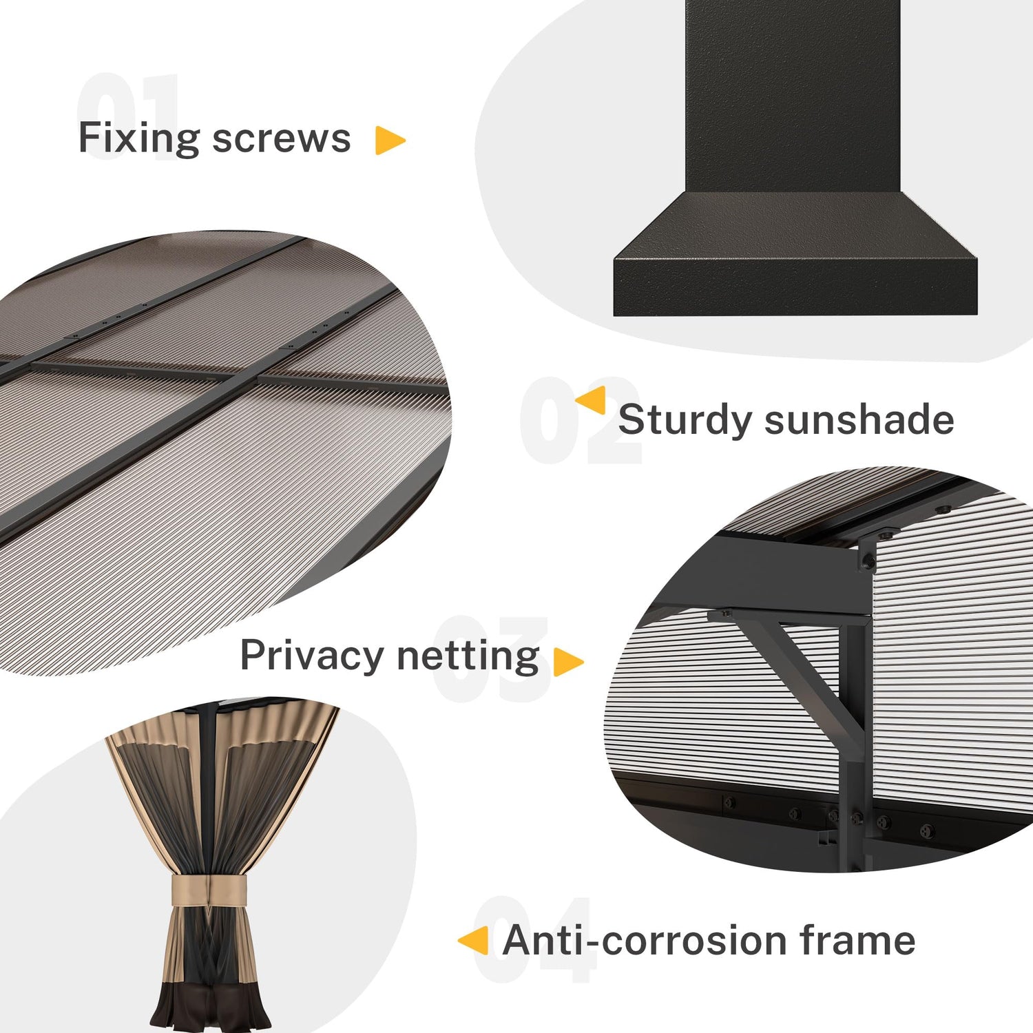 RTDTD 10' x 14' Gazebo,Hard Top Lean to Gazebo Wall Mount Heavy Hardtop Gazebo Outdoor Pergola with Curtains and Netting for Patio Garden Lawn Backyard Deck (Brown)