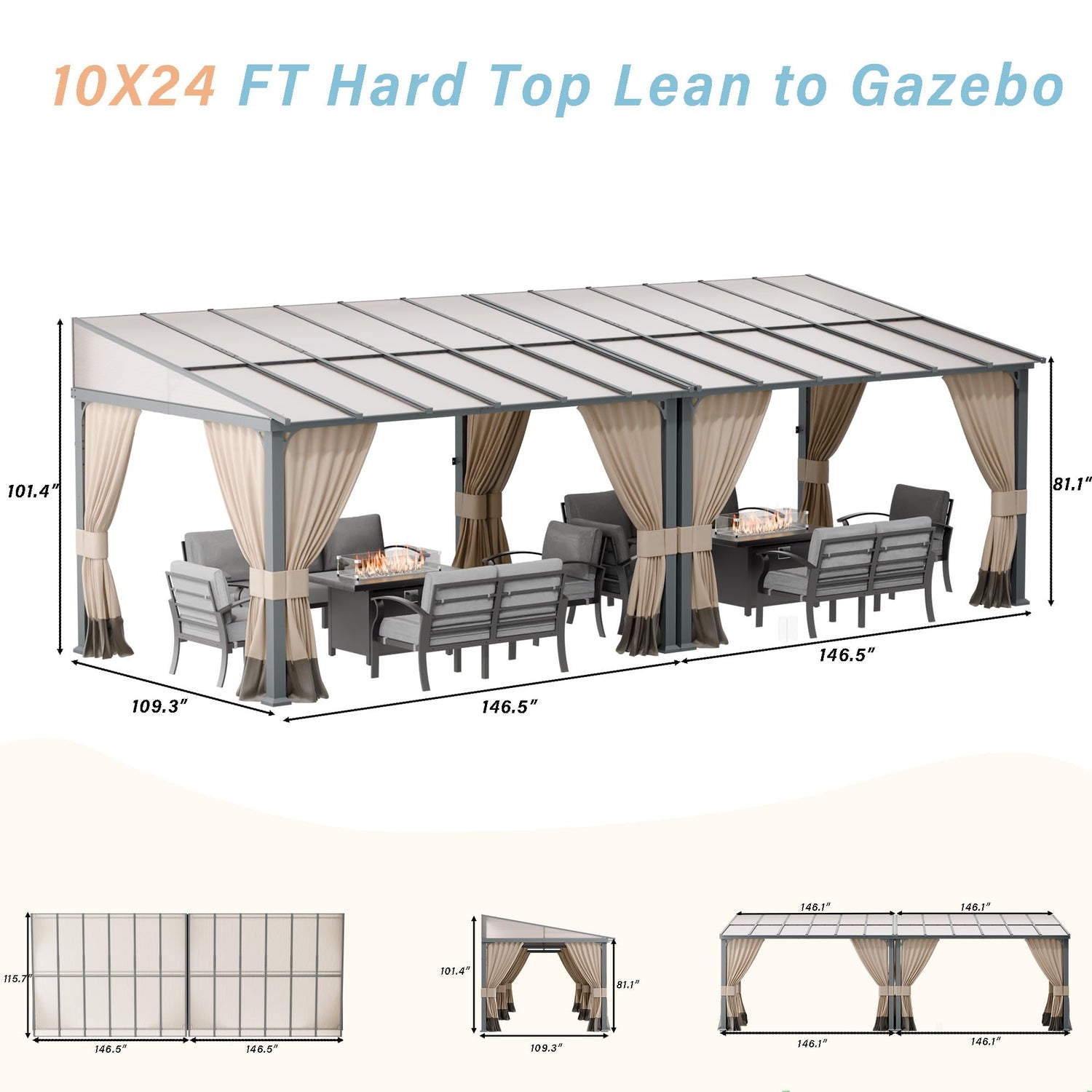 RTDTD 10' x 24' Gazebo,Hard Top Lean to Gazebo Wall Mount Heavy Hardtop Gazebo Outdoor Pergola with Curtains and Netting for Patio Garden Lawn Backyard Deck (Brown)
