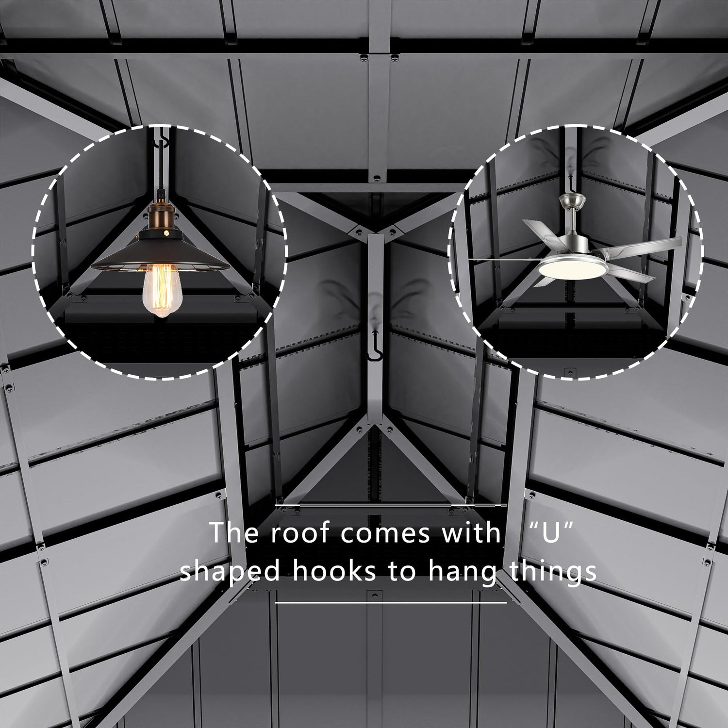 - DESIGN: Outdoor aluminum frame permanent gazebo is equipped with zippered removable curtains and netting, ventilation and safety. With the curtains down is a space of absolute privacy, will not be disturbed and prying. There are hooks on the roof for hanging electric fans and lighting fixtures.