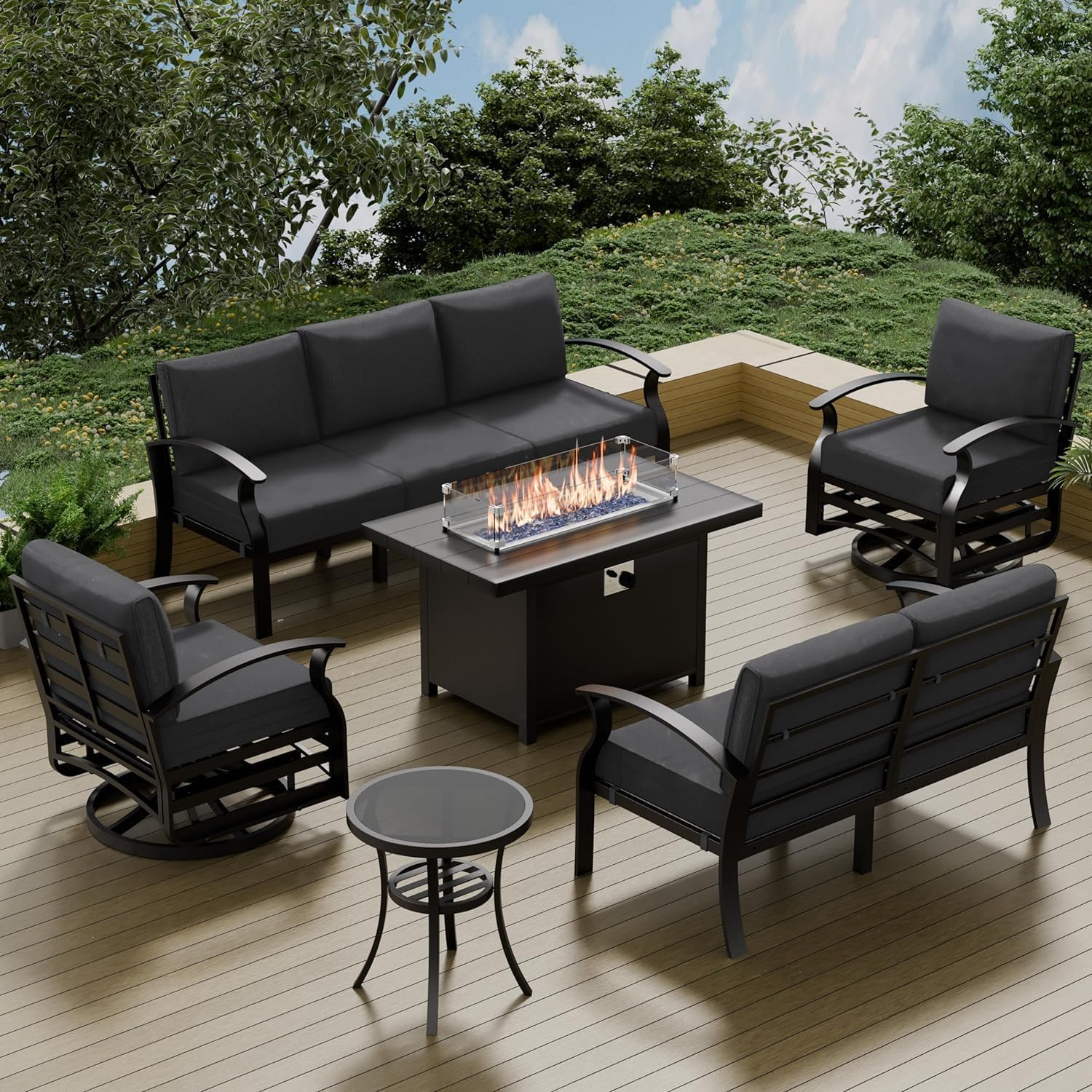 - OUTDOOR FURNITURE: Aluminum patio furniture set has a total of 1 triple seat armchair, 1 double seat armchair, 2 swivel rocking chairs, a coffee table and a fire pit table. Patio furniture set has a variety of chairs for different scenarios of gatherings. It is a very nice thing to gather with your loved and friends in a festive atmosphere.
