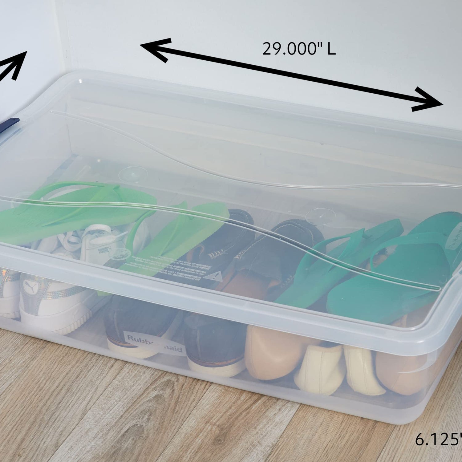Details: Declutter like a pro with the Rubbermaid Cleverstore 42 Quart 4-pack stackable plastic container. Organizing your home or office space has never been easier. Reign all the mess in with these durable clear storage bins. Say goodbye to opening and closing multiple boxes just to find what you are looking for. With the Rubbermaid 4-pack stackable plastic containers’ clear design, it makes you see exactly where all your things are. Made with sturdy plastic material and features a recessed lid construction that ensures stability and allows plastic storage bins to stack securely for ease of moving, efficient use of space for your closet, garage, storeroom, or even for traveling. By simply snapping the latching lid into place, your valuable items stay safe inside the storage tote. The outside dimensions of these clear storage containers measure 29 inches long, 17.75 inches wide, and 6.3 inches tall while its inside dimensions measure 24.50 inches long, 15 inches wide, and 5.36 inches tall. Load capacity reaches up to 32.6 pounds or 42 quarts. Its shallow 6-inch height makes it a great storage container for small items. Papers, art supplies, kitchen spices, hats and gloves, toys, office supplies, and more will fit inside the latching tote. Your space will look neat and tidy in no time. Keep your items well-organized with the 4-pack of Rubbermaid Cleverstore 42-Quart Plastic Storage Containers, there's a place for everything and more.