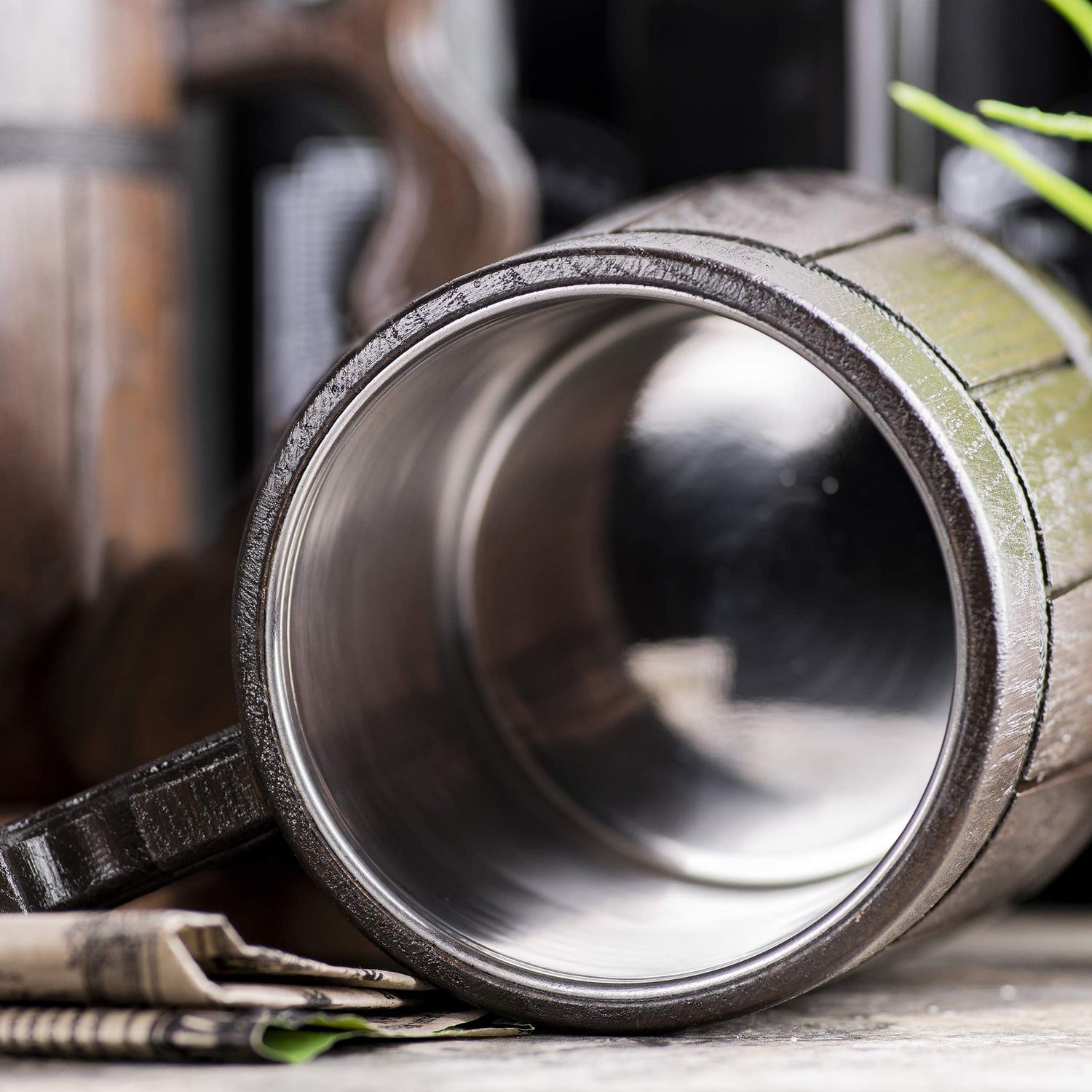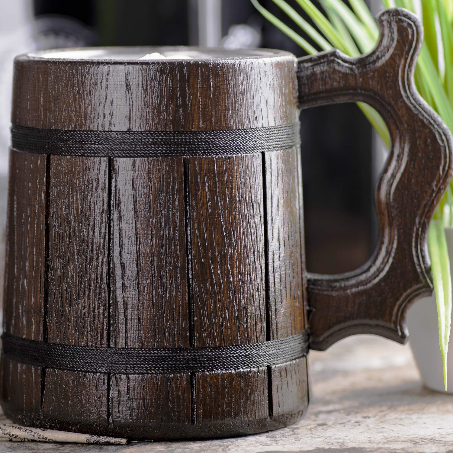 - Our beer mugs is made of oak and adorned with a copper label.