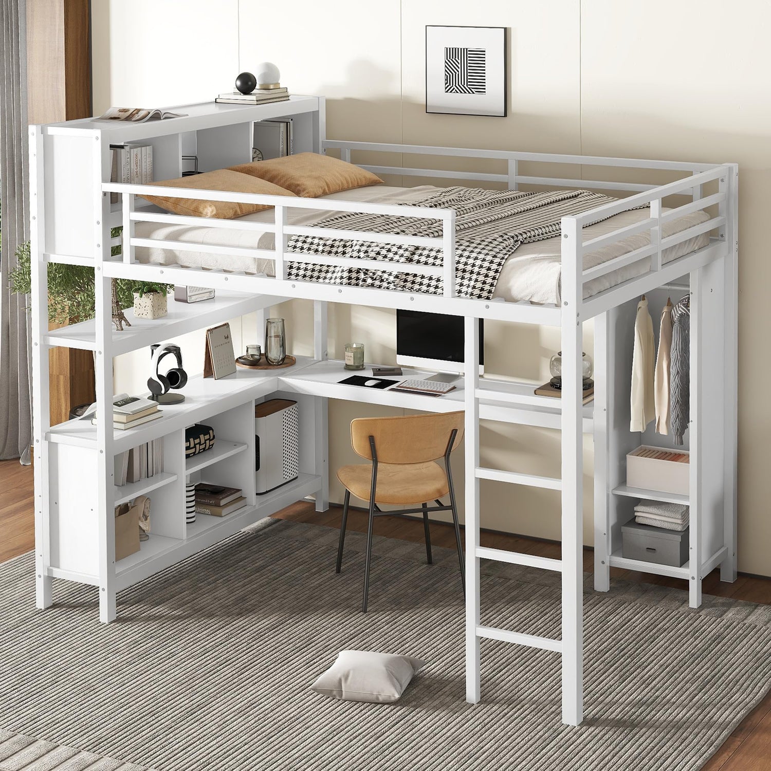 RuiSiSi Queen Size Loft Bed with L-Shaped Desk and Storage Wardrobe, Heavy Duty Metal Loft Bed with Storage Cubes and Shelves for Adults Kids, Space-Saving Loft Bed with Guardrail and Ladder, White