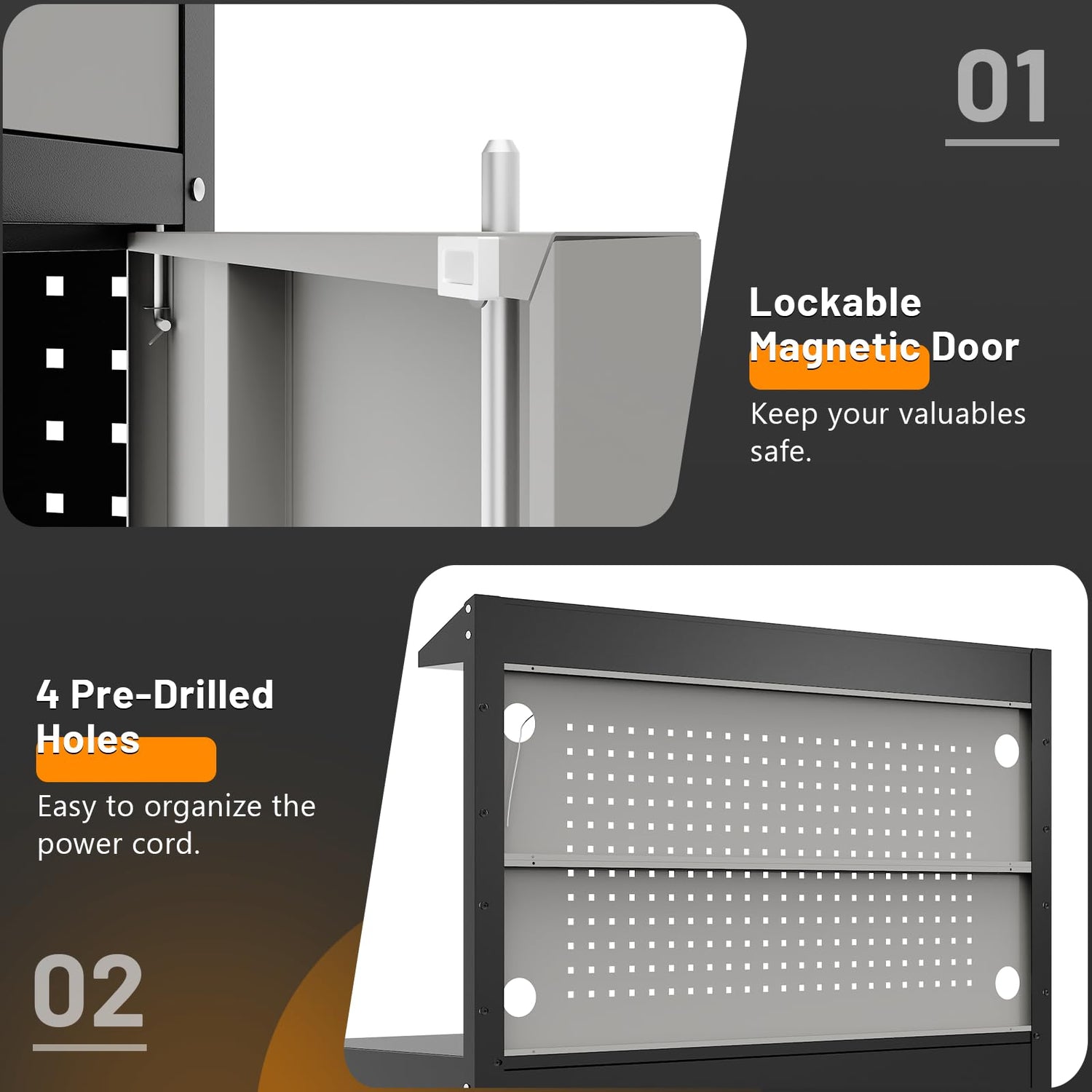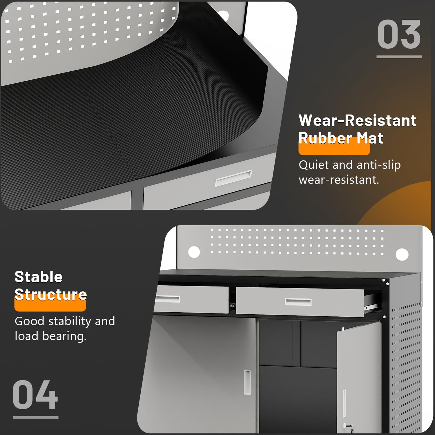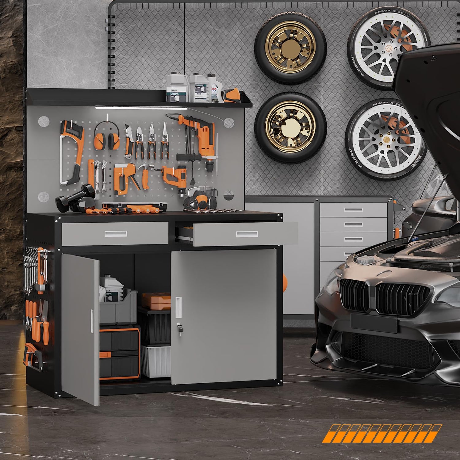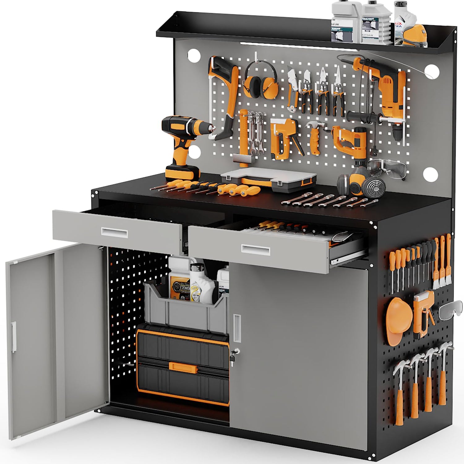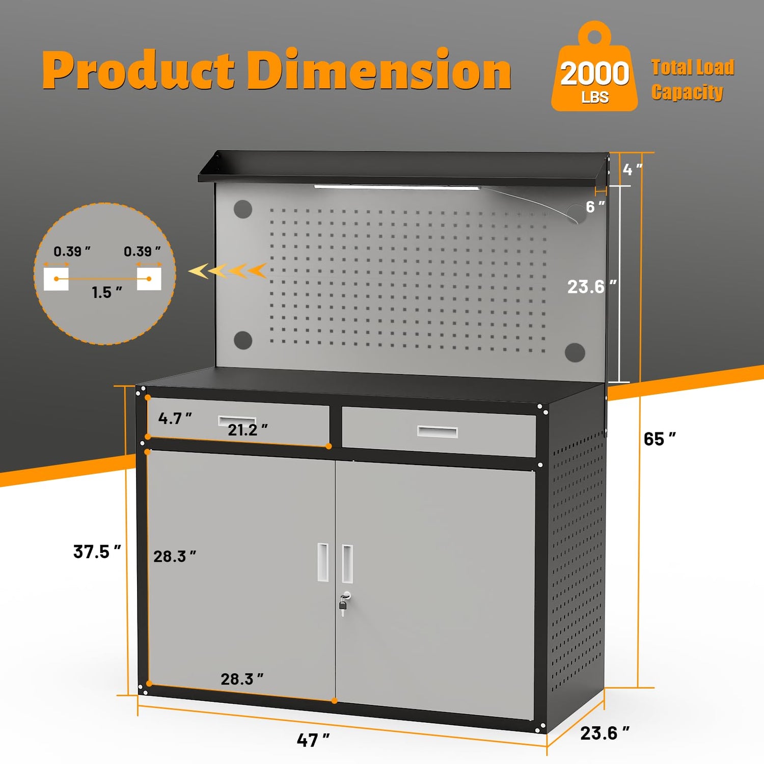 - ULTIMATE STORAGE SYSTEM:Industrial workbench for garage revolutionizes workspace efficiency.Workbench with 2 deep drawers for small tool organization.3-sided heavy-gauge pegboard for hanging pliers/screwdrivers.Workbench with lockable magnetic cabinets to storage power tools.23.6" vertical pegboard workbench backer maximizes wall storage without sacrificing bench space.Workbench with storage 4"x6" top extension shelf holds frequently used lubricants or measuring tools.