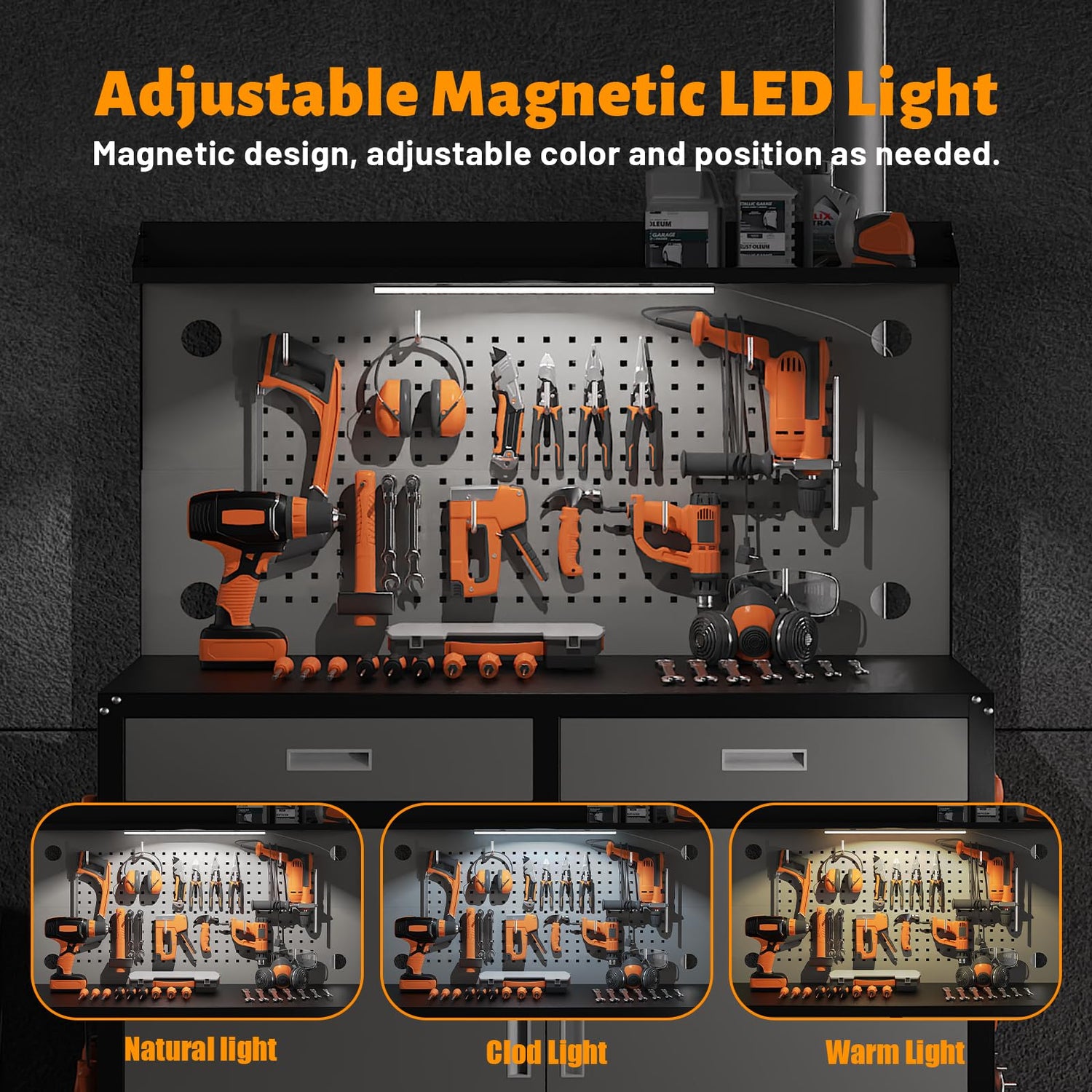 - INTEGRATED LED TASK LIGHTING: Workbench is equipped with a 20" length of LED magnetic strip that can be mounted anywhere on the workbench. The LEDs have an adjustable color temperature of 3000K-6000K (warm to cool) and the lumens can be adjusted on the fly as needed. There are 4 cable reservation ports on the pegboard of tool workbench, easy to organize the cables used while working and keep the table tidy.