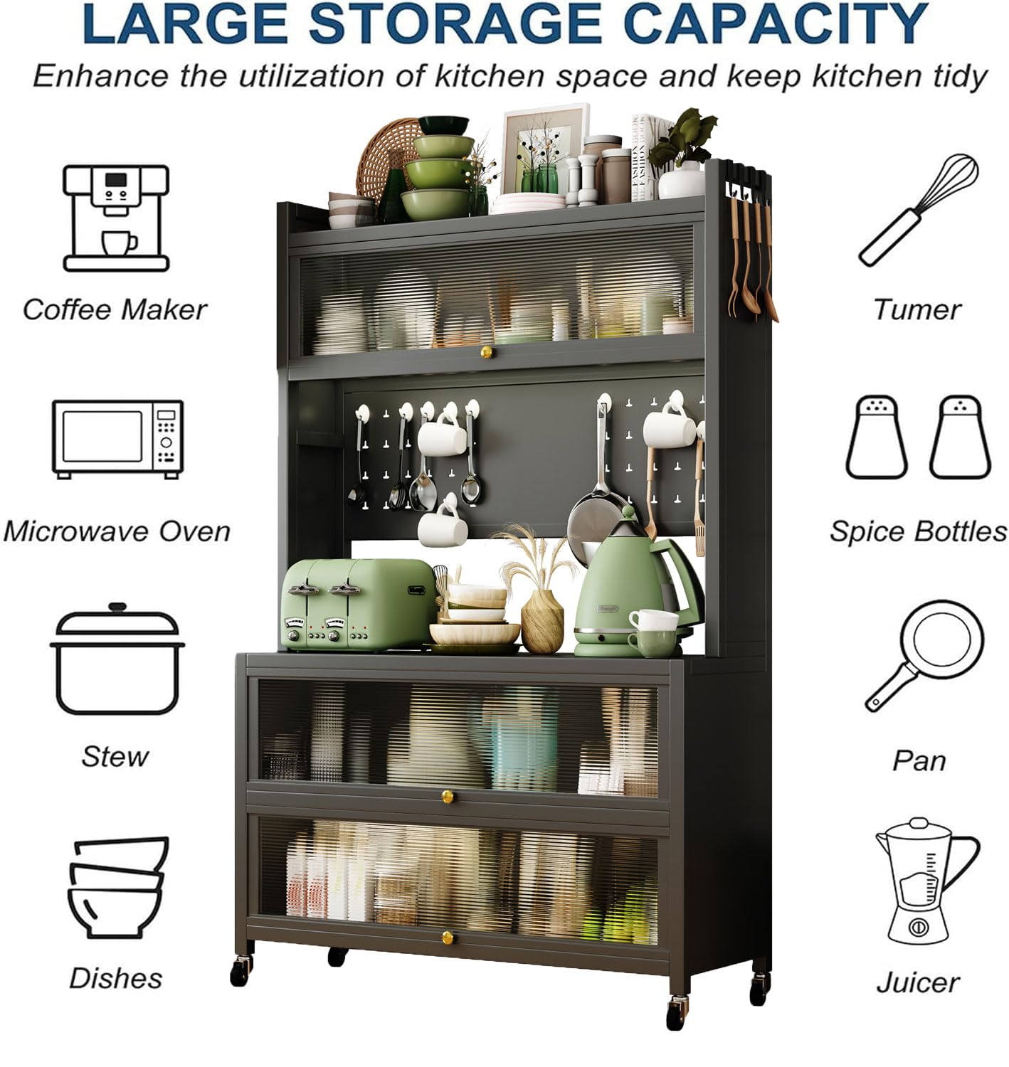 Runboll Kitchen Pantry Cabinet Storage with Microwave Shelf 5 Tier Metal Sideboard Baker's Rack Coffee Bar Hutch Buffet Laundry Storage, with Wheels & Hooks