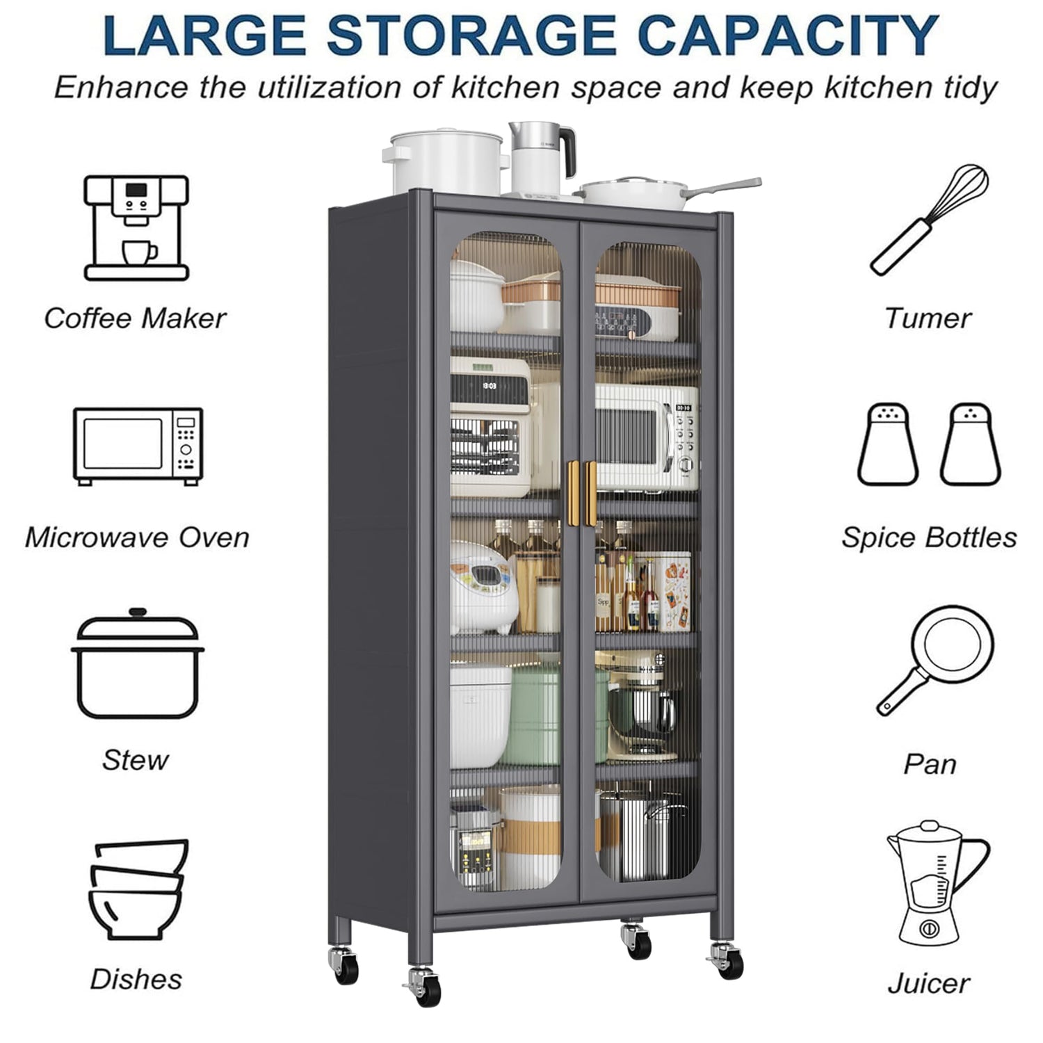 Runboll Kitchen Pantry Storage Cabinet, 6 Tier Metal Sideboard with Wheels and Acrylic Glass Door, Modern Display Curio Cabinet Bookcase