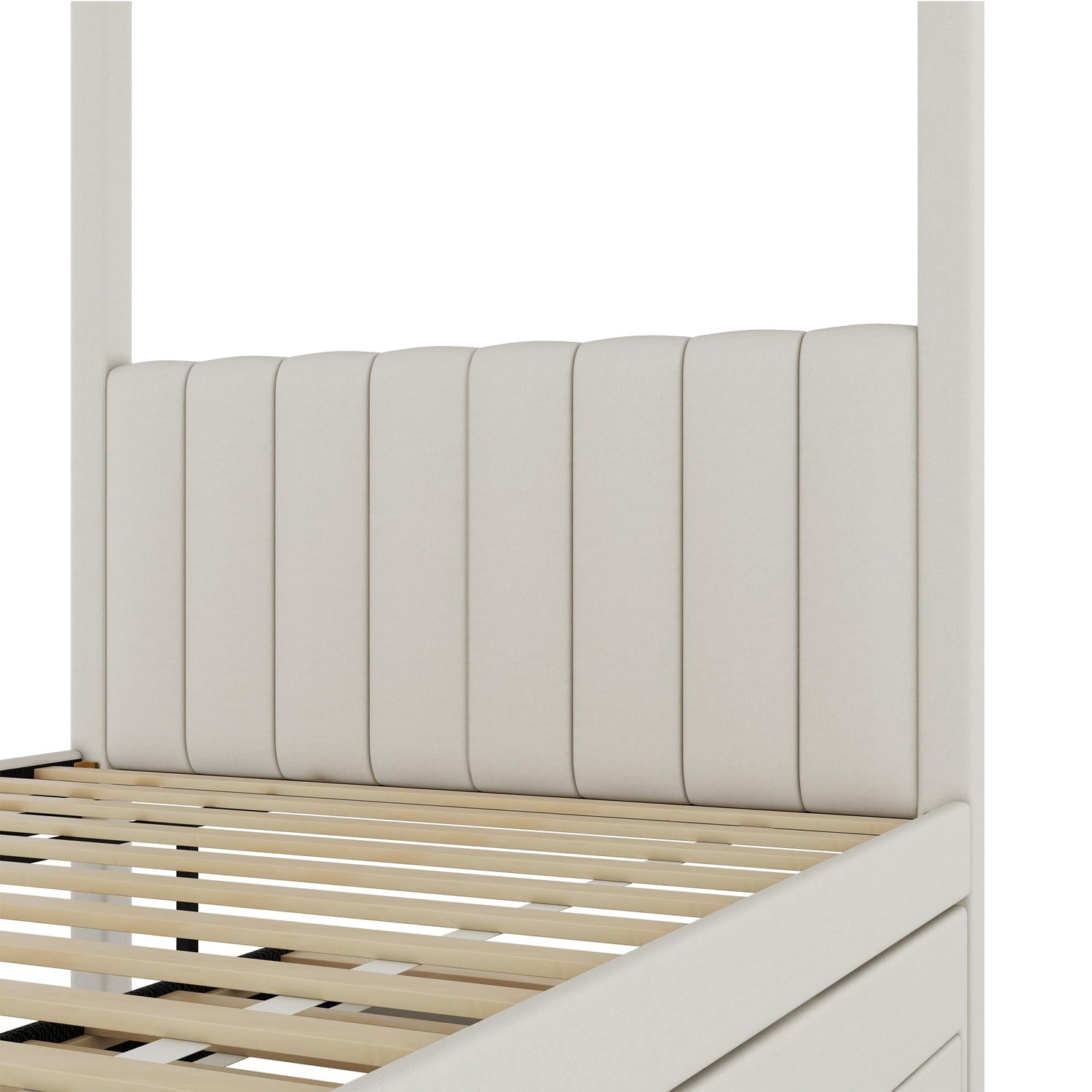 Introducing the Modern Upholstered Canopy Platform Bed with Trundle and Storage Drawers by RUNNA. This exquisite full-size bed in a chic beige/linen finish is designed to be the stunning centrepiece of your bedroom, combining elegance with functionality.