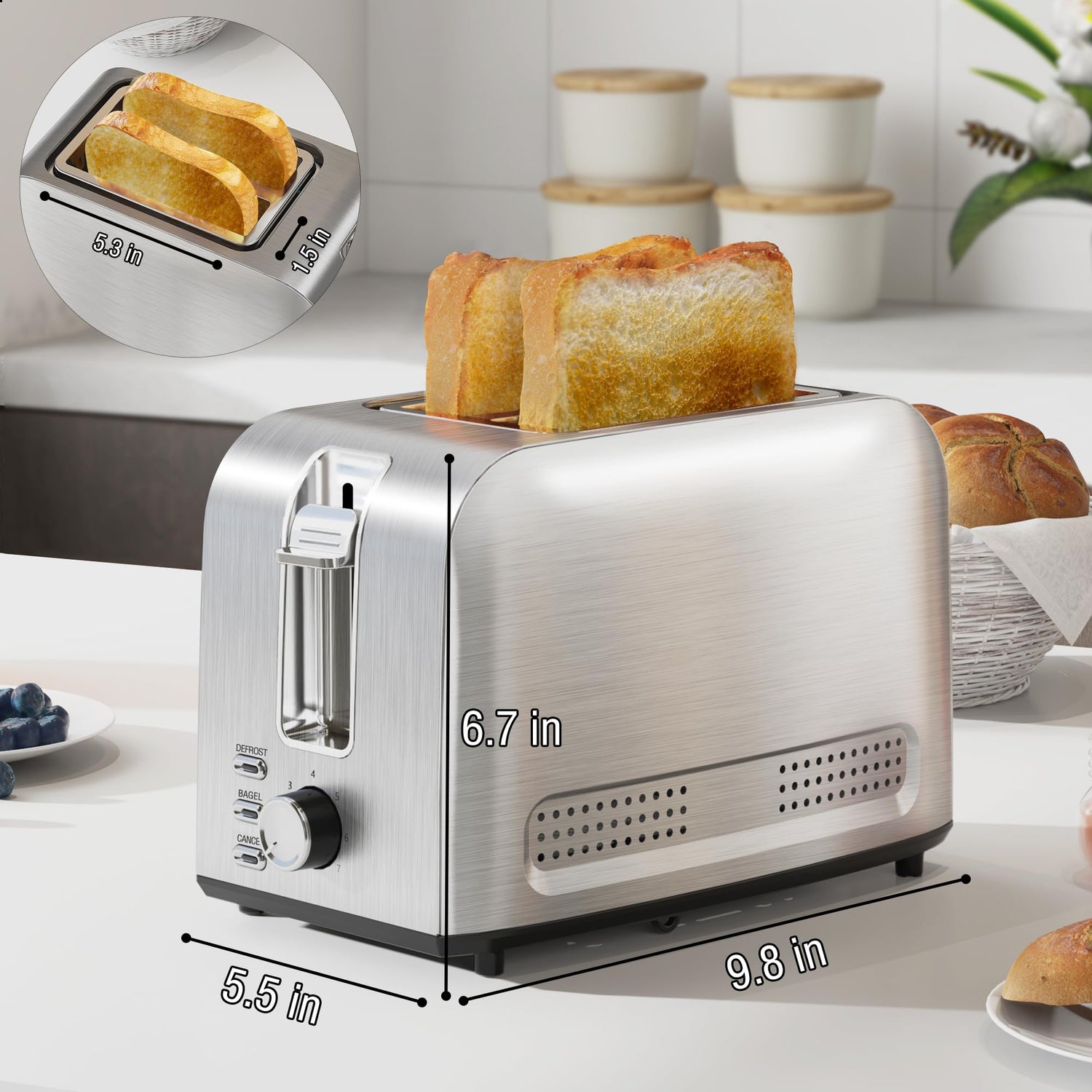 Runnatal 2 Slice Toaster, 100% Stainless Steel, Wide Slot Toaster Multifunctional with 7 Toast Settings, Defrost, BAGEL, Cancel Functions, Easy to Operate and Clean 120V 800W Silver Metallic