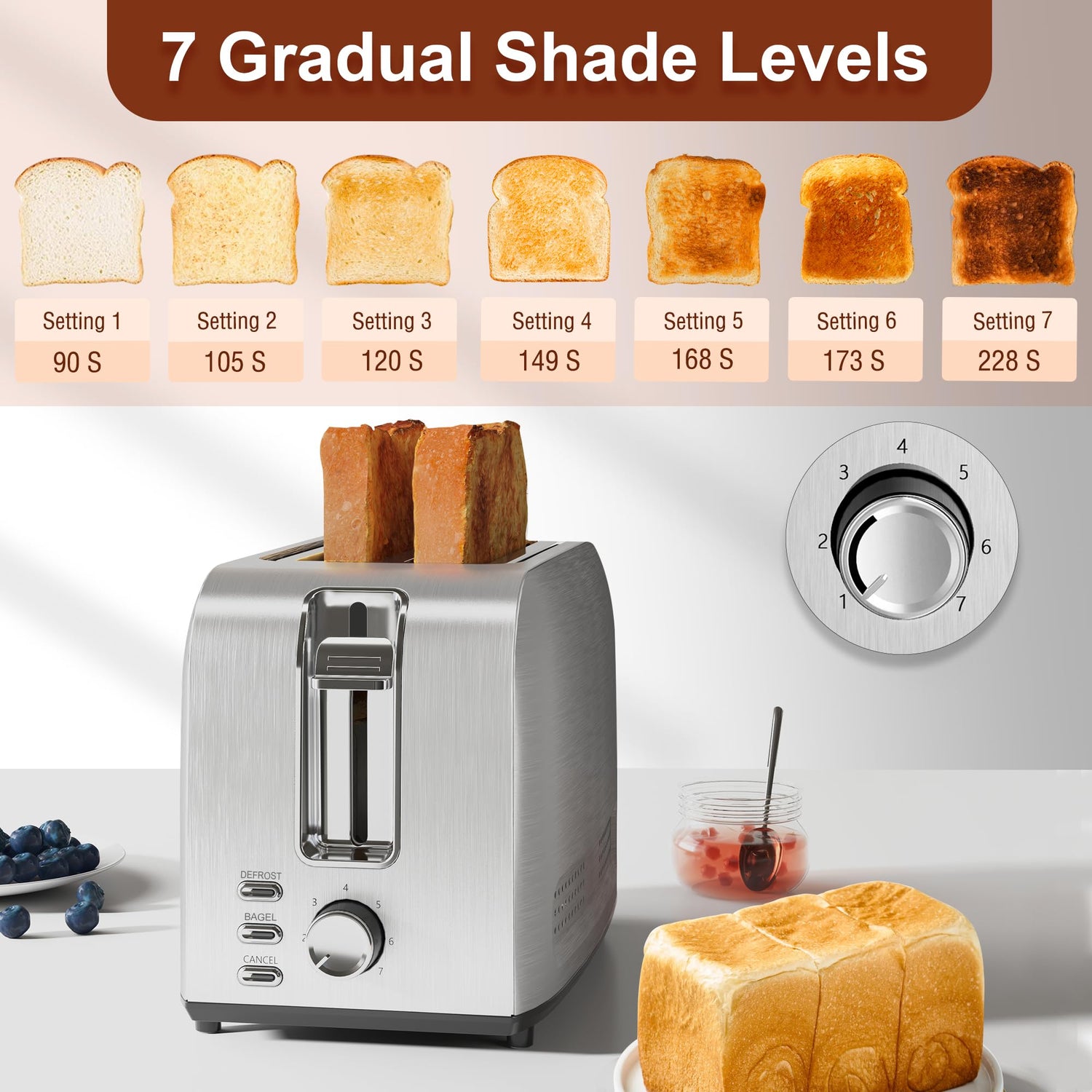 - 🍞【7 Toast Settings & Easy to Operate】The baking level of this toaster is adjustable. There are 7 Toast Settings in total, you can choose the degrees of toasting you like, and the operation is very simple.