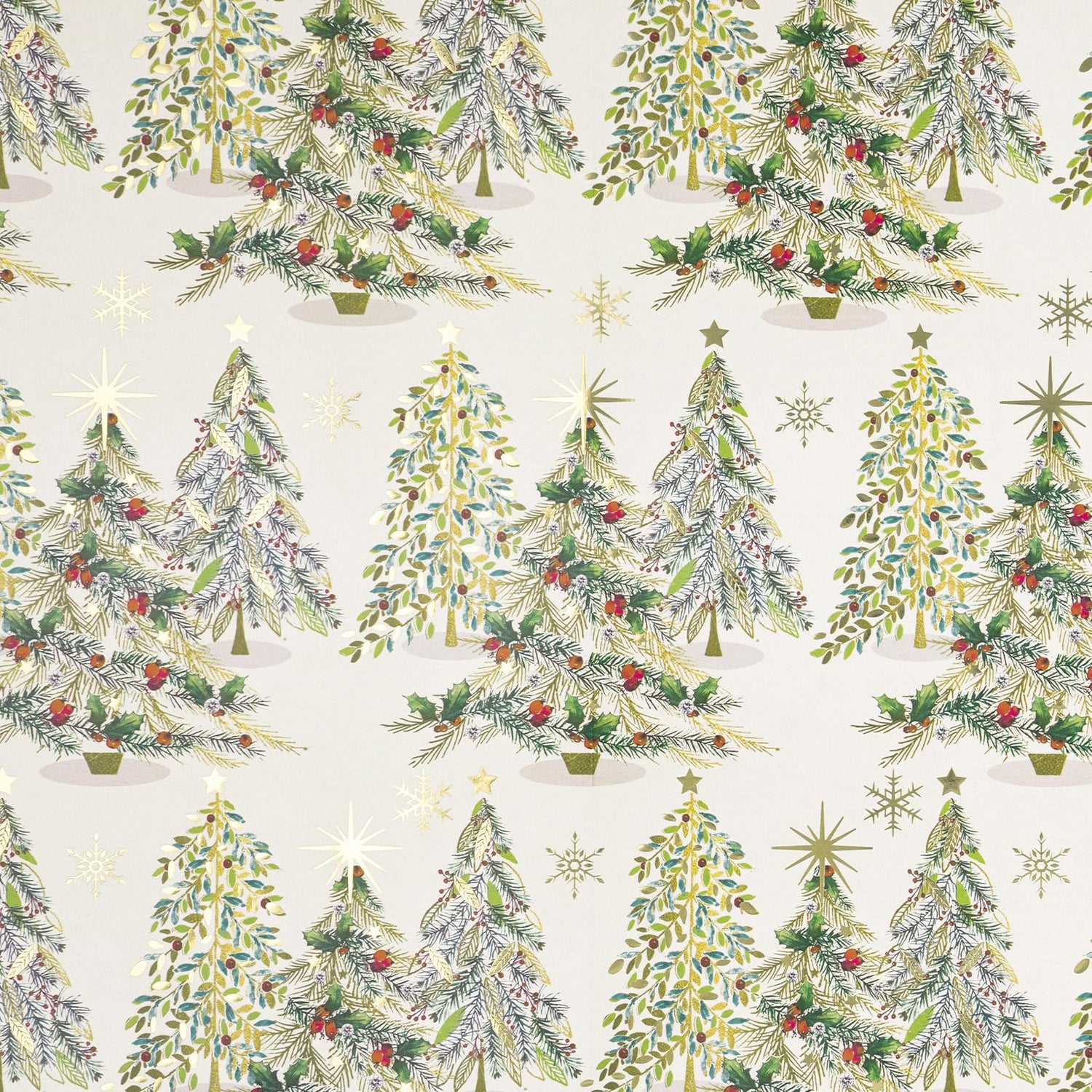 - Elegant Christmas Tree Design: Features gold foil luxurious array of golden and frosted white Christmas trees with red berries, lush garlands and gold star toppers, evoking a refined holiday elegance