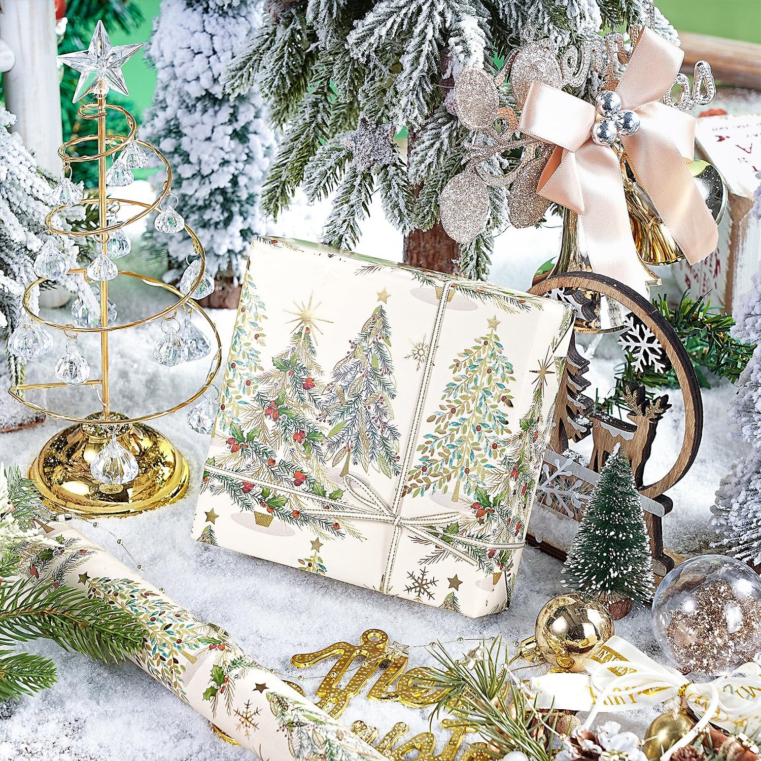 RUSEPEA Luxury Christmas Tree Wrapping Paper Roll, Mini Roll, Elegant Gold Foil Xmas Tree Gift Wrap Paper for Holiday Gifts, Party, DIY Crafts (17in x 16.4ft)