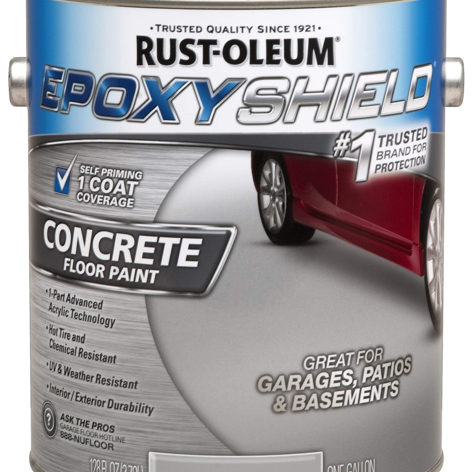Freshen up your concrete floors with Rust-Oleum EPOXYSHIELD Concrete Floor Paint. This self-priming acrylic paint requires only one coat and resists fading, chipping and stains, even when exposed to sunlight, weather, hot tires or chemicals.