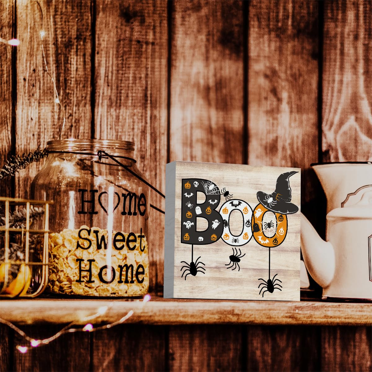 Rustic Boo Witch Spider Halloween Wooden Box Sign Cute Fall Sign Decor Farmhouse Decorative Wood Box Sign Block Plaque for Wall Desk Home Bathroom Decoration 5 x 5 Inches
