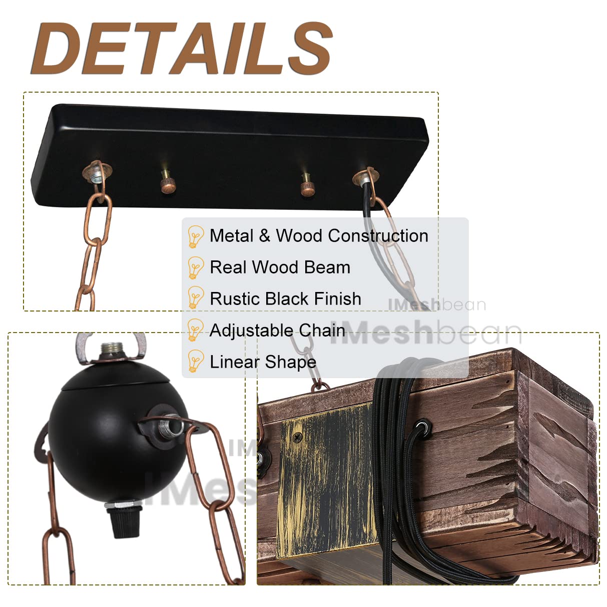 Details: Material: wood ,Iron; Sturdy and durable;Adjustable chain for easy installation. Style:Natural wood beam wrapped with twisted cords; antique, vintage, rustic -will add a nice touch and create a sense of pristine elegance to home interior.