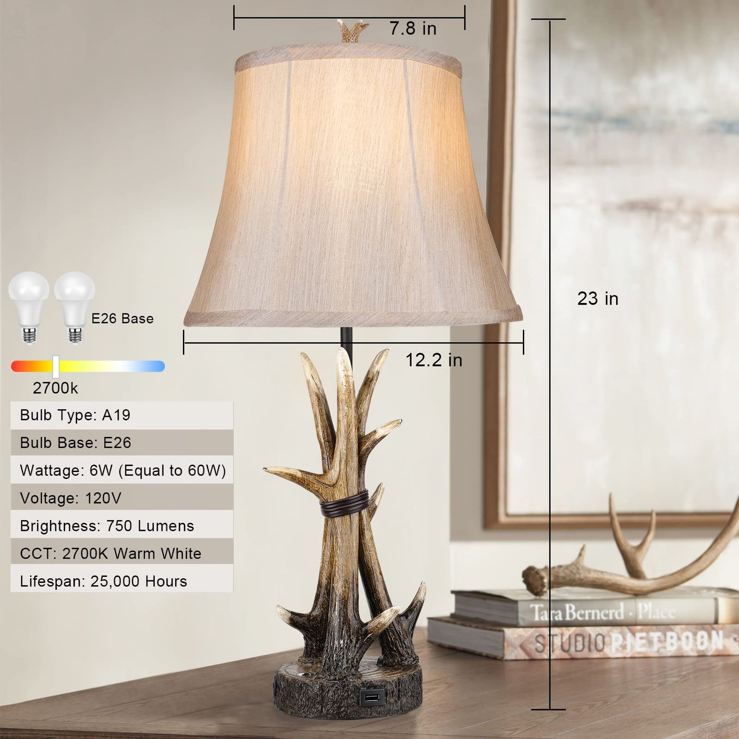 Rustic Table Lamps for Living Room Set of 2, Farmhouse Antler Western Bedside Lamp for Bedroom with 2 USB Charging Port, 3-Way Dimmable Resin Nightstand Lamps with Shade Decor, LED Bulbs Included