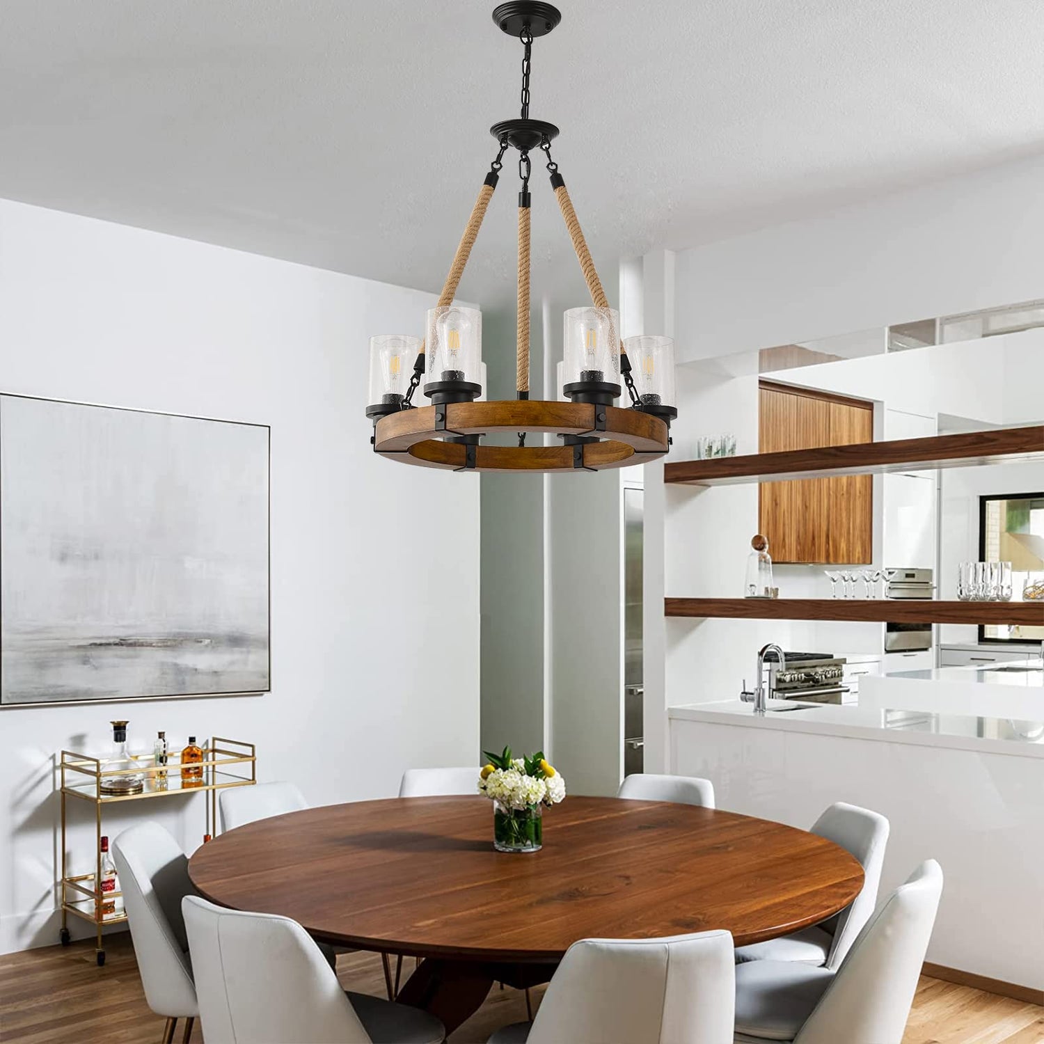 - 【6-Light Wagon Wheel Chandelier】This eye-catching chandelier features a wagon wheel shaped and high quality real wood frame along with seeded glass shade, brings a vintage rustic look to your home.The three natural ropes present a classic and modern farmhouse aesthetic.It is a great choice for impressing in the dining room, living room and bedroom as well as the foyer and kitchen.