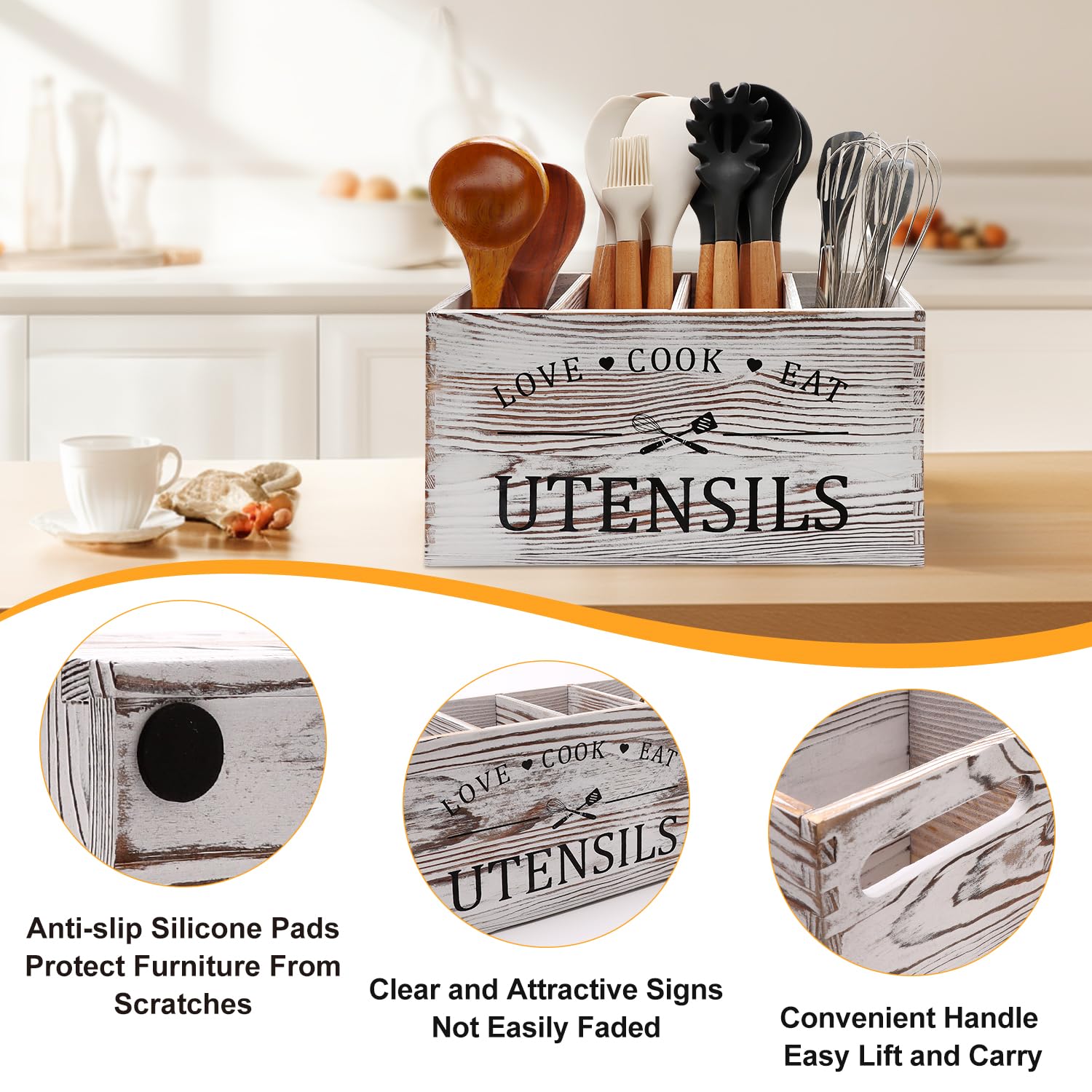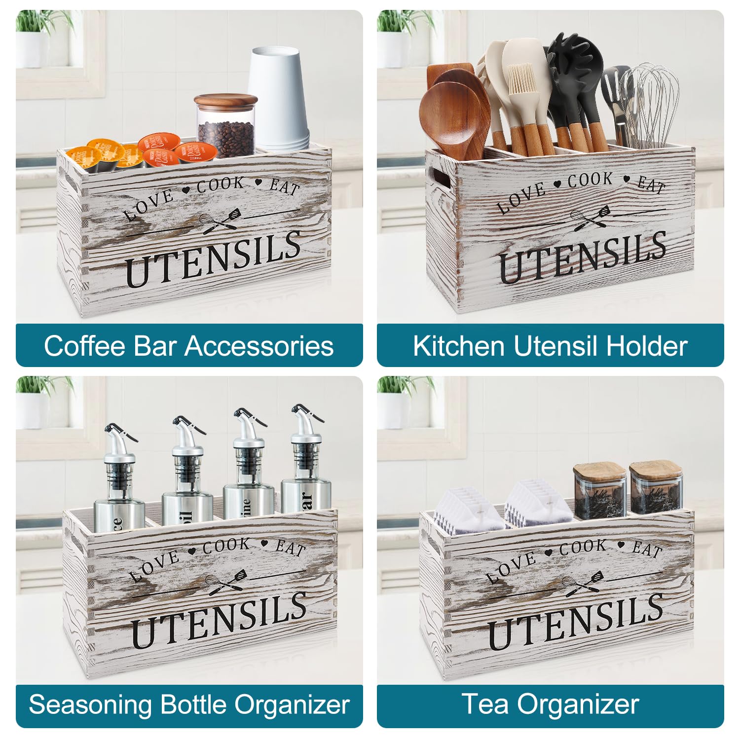 - WIDELY USED: This wood utensil caddy can store not only cooking utensils,spoons, ladles, tongs, spatula, but also oil bottles, coffee accesories. Very farmhouse looking in your kitchen counter.