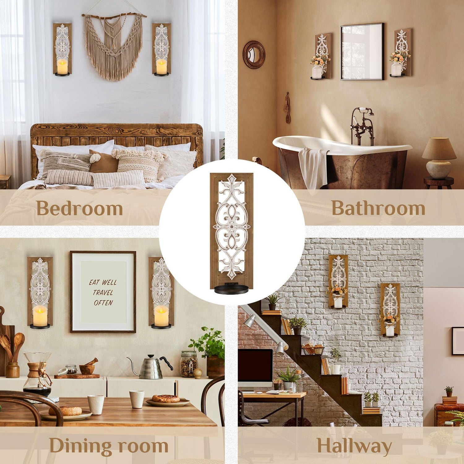 • HANDMADE WALL ART - Each wooden candle holder pillar is carved by handicraftsman, with 3D embossed distressed floral patern and brown wood frame design, adding add a vintage look and french country decor style to your home with this of wall sconce.