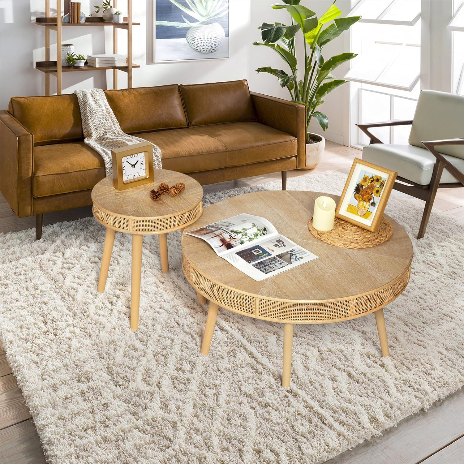 RUSTOWN 2-Piece Farmhouse Coffee Table, Modern Rustic Sofa Side Tea Tables, Solid Wood Finish with Crafted Rattan Side and End Table Sets for Living Room (Natural)