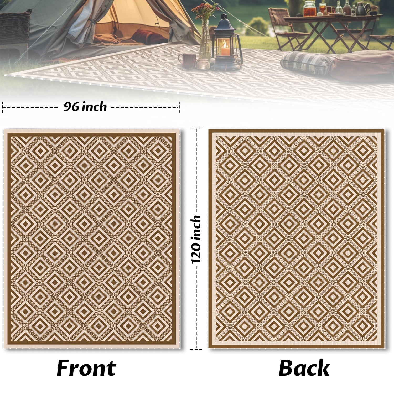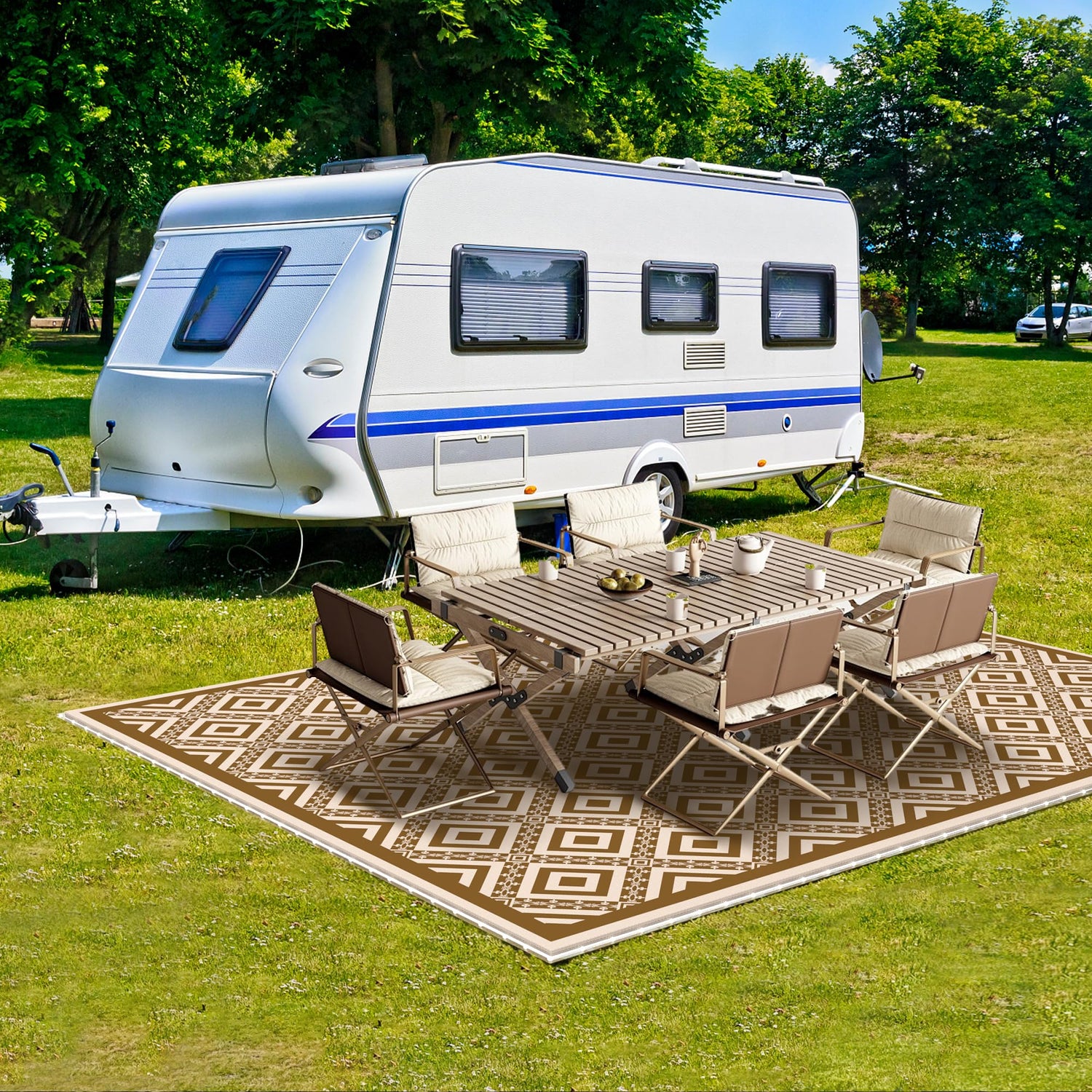 RV Outdoor Rug with Lights 8x10ft, Outdoor Camping Rug, Waterproof, Easy Cleaning, Non Shedding, Foldable and Portable, Reversible Mats for RV, Deck, Beach, Camping, Patio, Picnic (Brown & White)