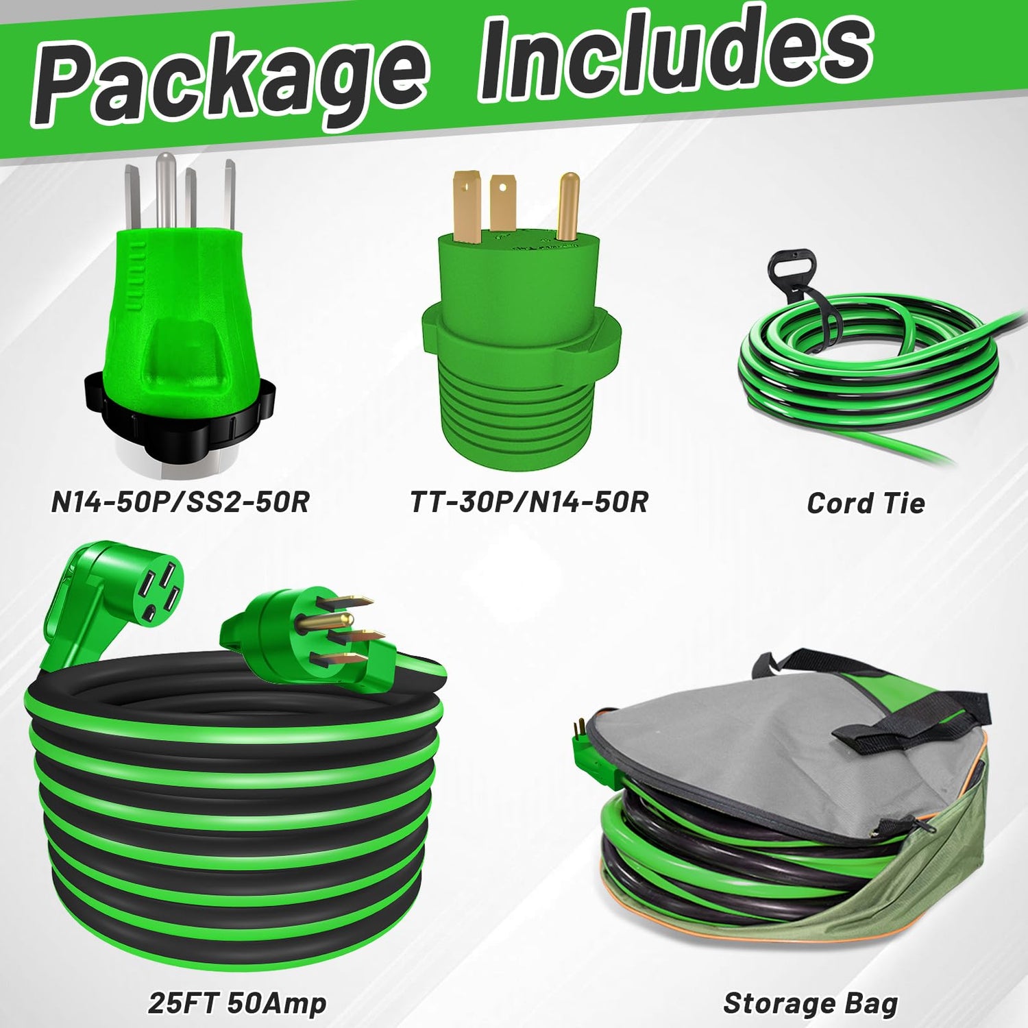 Details: RVPLAN 25 FT 50 Amp RV/EV Extension Cord Outdoor Waterproof,4 Prong Flexible Heavy Duty STW RV Power Cord,NEMA 14-50P/R Standard Plug Suit for EV Charging and RV Trailer Campers, Black-Green,ETL
